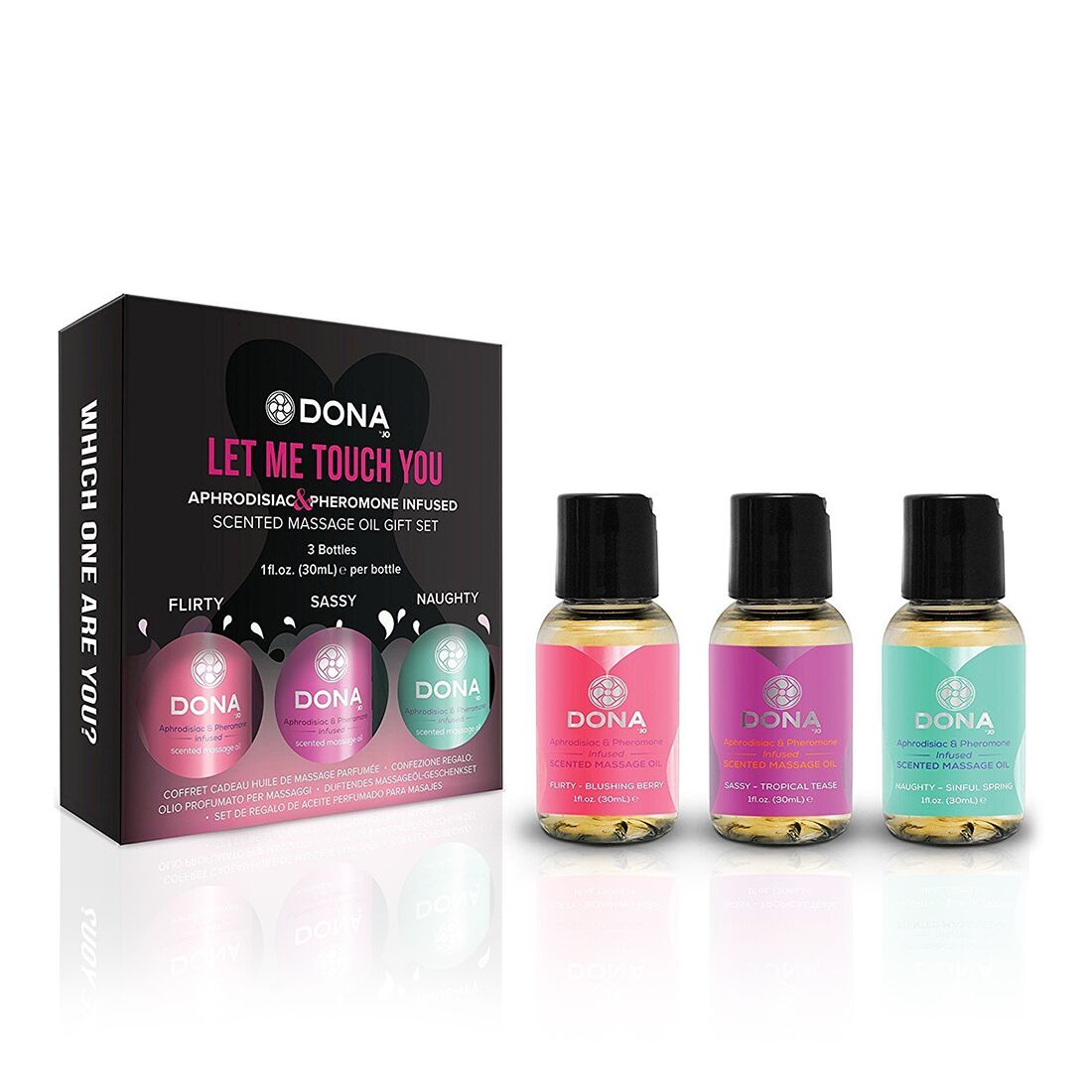 Пропонуємо купити набір масажних олій DONA LET ME TOUCH YOU з афродизіаками та феромонами — відразу три чудові аромати в одному наборі!