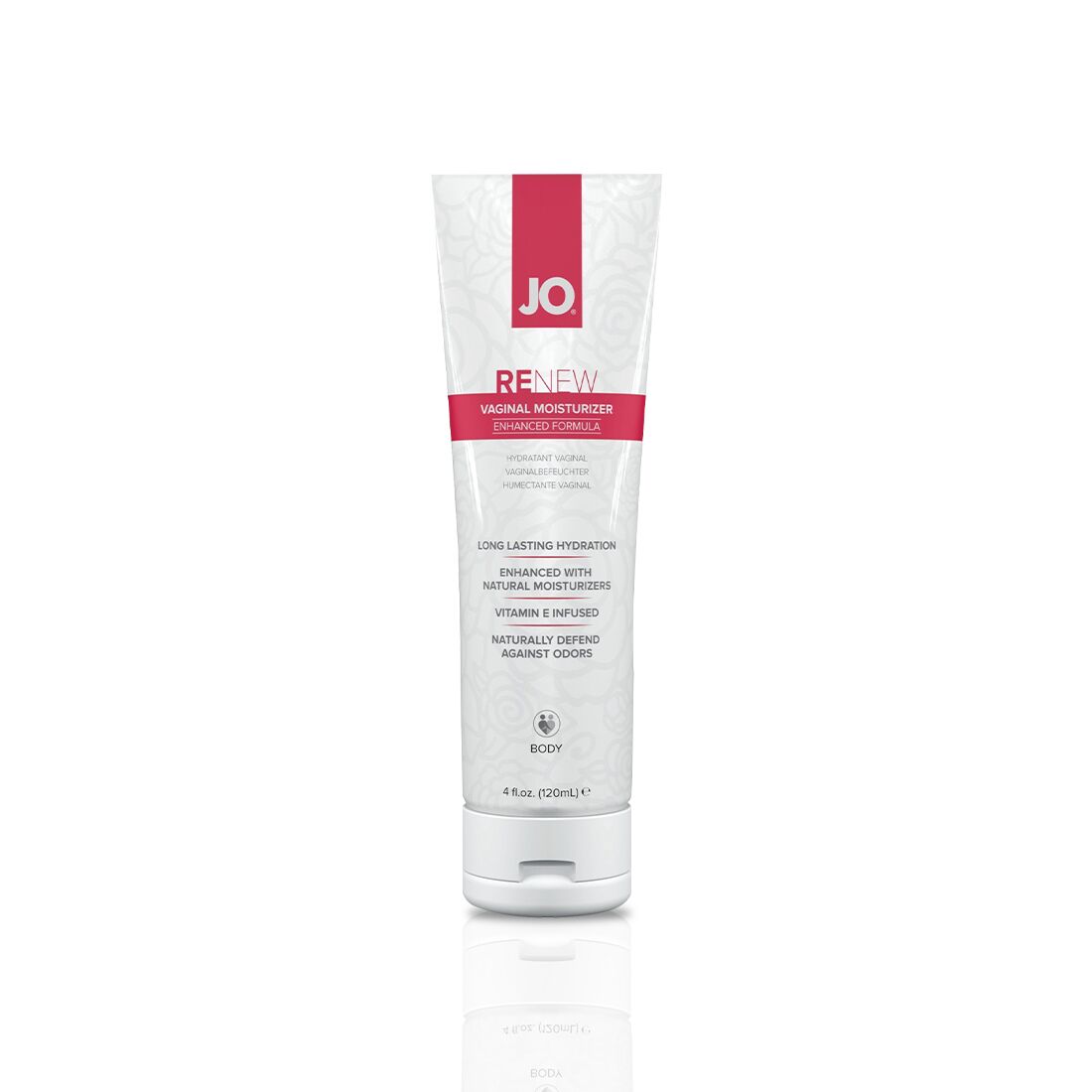 JO Renew — інтенсивно зволожувальний крем спеціально розроблений для жінок, що забезпечує тривалий комфорт без відчуття липкості. Поєднання зволожувальних речовин, включно з бісабололом, алое вера та екстрактом огірка, усуває сухість піхви та підтримує природну жіночу лубрикацію завдяки натуральним інгредієнтам, які знижують втрату вологи в ніжній інтимній зоні. Крем із густою ніжною текстурою не тече й підходить для застосування як вдень, так і вночі. У формулі крему не міститься парабенів, пропіленгліколю та ароматизаторів. Забезпечує миттєвий результат та комфорт. Без додавання гліцерину. Ідеально підходить для чутливої ​​шкіри. Рекомендується застосовувати: під час менопауз, гормональної терапії, стресів, у разі дискомфорту через сухість піхви. Крем залишає на весь день відчуття свіжості та комфорту.