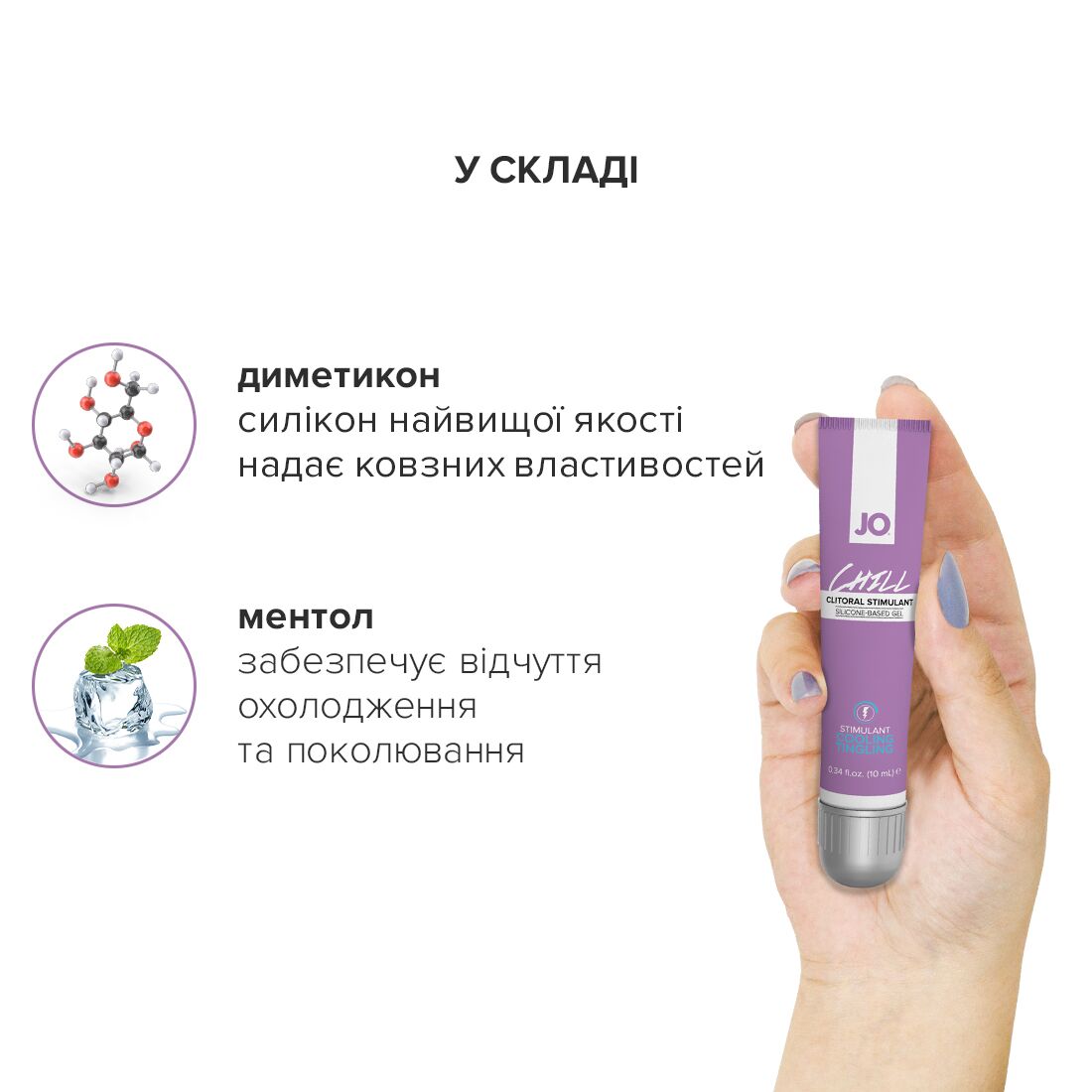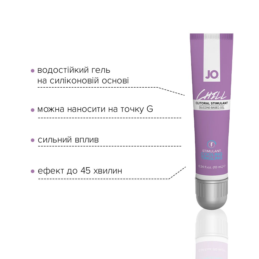 Стимулювальний гель для клітора System JO CHILL COOLING забезпечує тривале ніжне ковзання; виготовлений із високоякісного силікону, не містить консервантів і не боїться води, даючи можливість втішатися в нестандартних умовах. Прекрасна ідея для тих, хто шукає незвичайних відчуттів: легке поколювання, як холодний електричний струм, зробить самостійні або спільні з партнером пестощі ще інтенсивнішими. Крім того, такий гель має збуджувальну дію і чудово підійде для «швидкого сексу». Ефект залежить від індивідуальної чутливості.