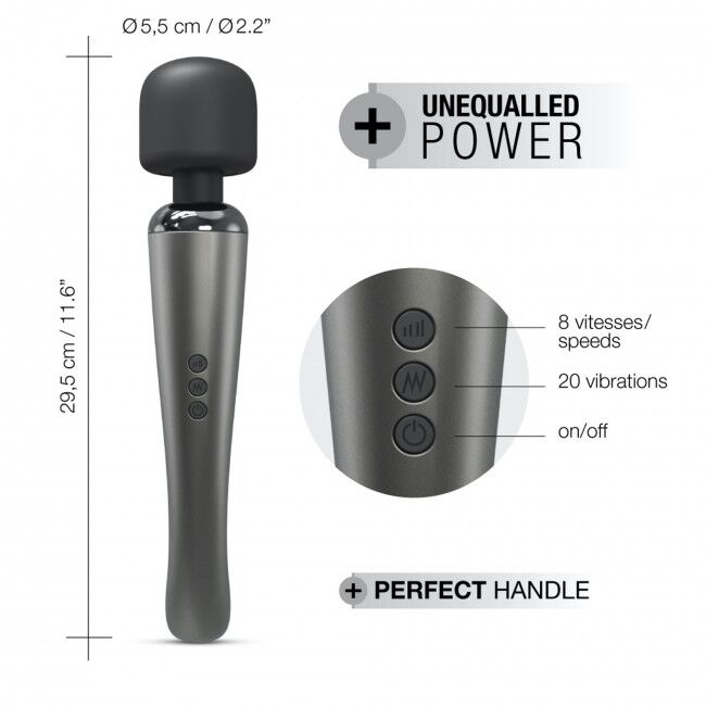 Елегантний і потужний вібромасажер Dorcel Megawand Chrome Silver який перезаряджається, 160 режимів – це 160 варіантів інтенсивної стимуляції тіла та ваших ерогенних зон. Зняти напругу в кінці робочого дня з втомлених м'язів? Позбутися болю в спині? Просто зробити собі приємно ніжними дотиками до шкіри та тіла. Вібромасажер легко впорається із цими завданнями завдяки великій силіконовій голівці, 20 режимам вібрації та 8 рівням інтенсивності. Сильні потоки вібрації дозволять вам максимально розслабитися від відчуття інтенсивного масажу або насолодитися хвилями приголомшливого кліторального оргазму. Вібромасажер повністю водонепроникний, тому ви легко можете поєднувати водні процедури з масажем або кліторальною стимуляцією. Керування здійснюється за допомогою трьох кнопок на корпусі: одна кнопка – увімкнення/вимкнення; друга – перемикає режими вібрації; третя – перемикає рівні інтенсивності.