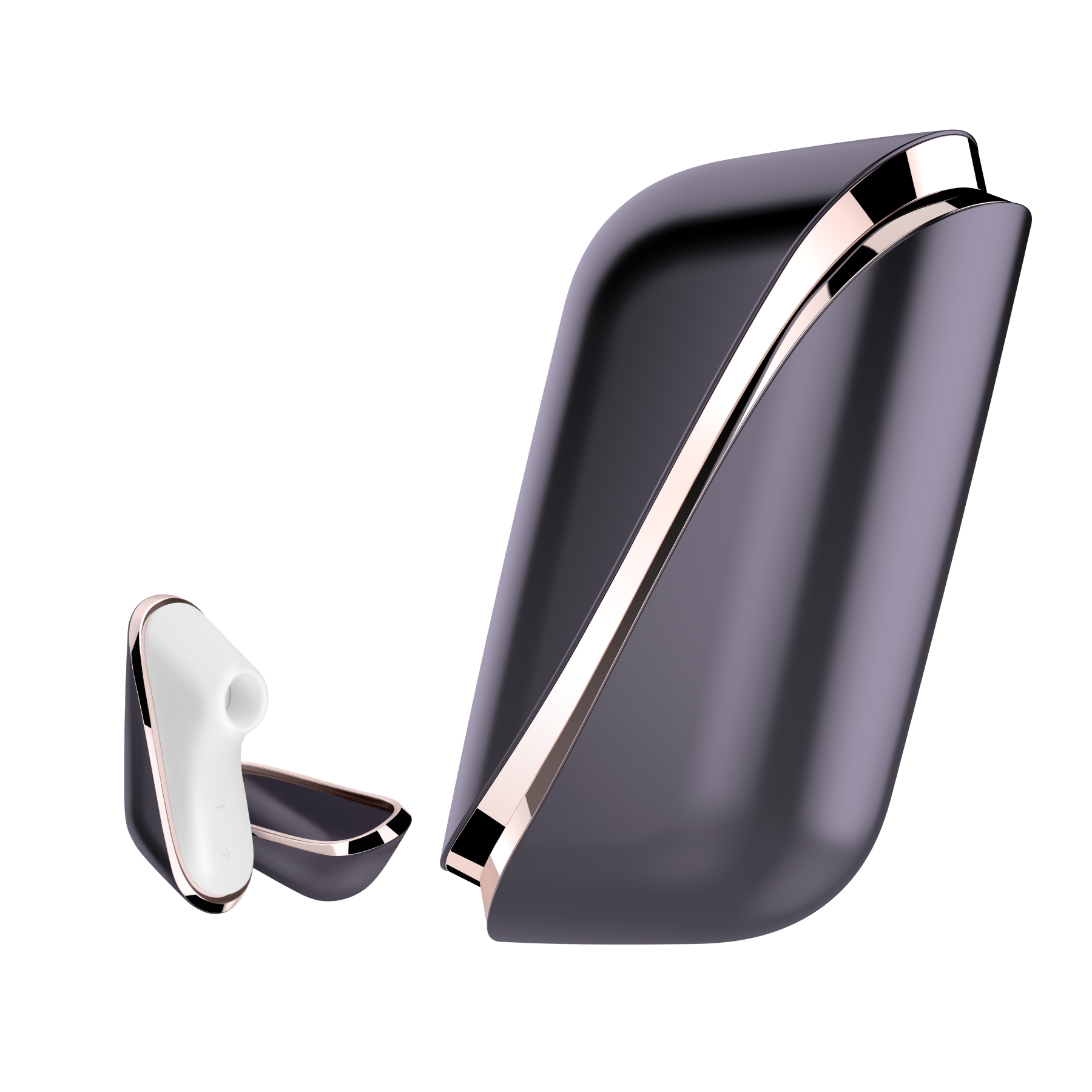 Внутрішня частина, що безпосередньо контактує з тілом, виконана з ніжного силікону білого кольору. Він гіпоалергенний, легко піддається очищенню, зносостійкий і приємний тактильно. Зовнішня частина виготовлена з сатинованого чорного АБС-пластику з красивою глянцевою окантовкою кольору рожевого золота. Половинки корпусу щільно прилягають один до одного завдяки магнітному замку з 24-х магнітів по периметру, не варто переживати, що вони випадково розкриються.