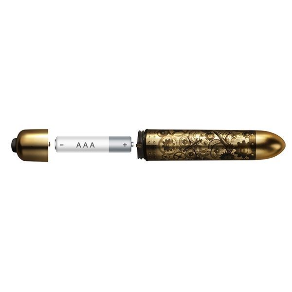 Вибратор выпускается в оттенке состаренного золота и украшена рисунками с стиле стимпанк. Такой аксессуар может стать очень личным и запоминающимся подарком.