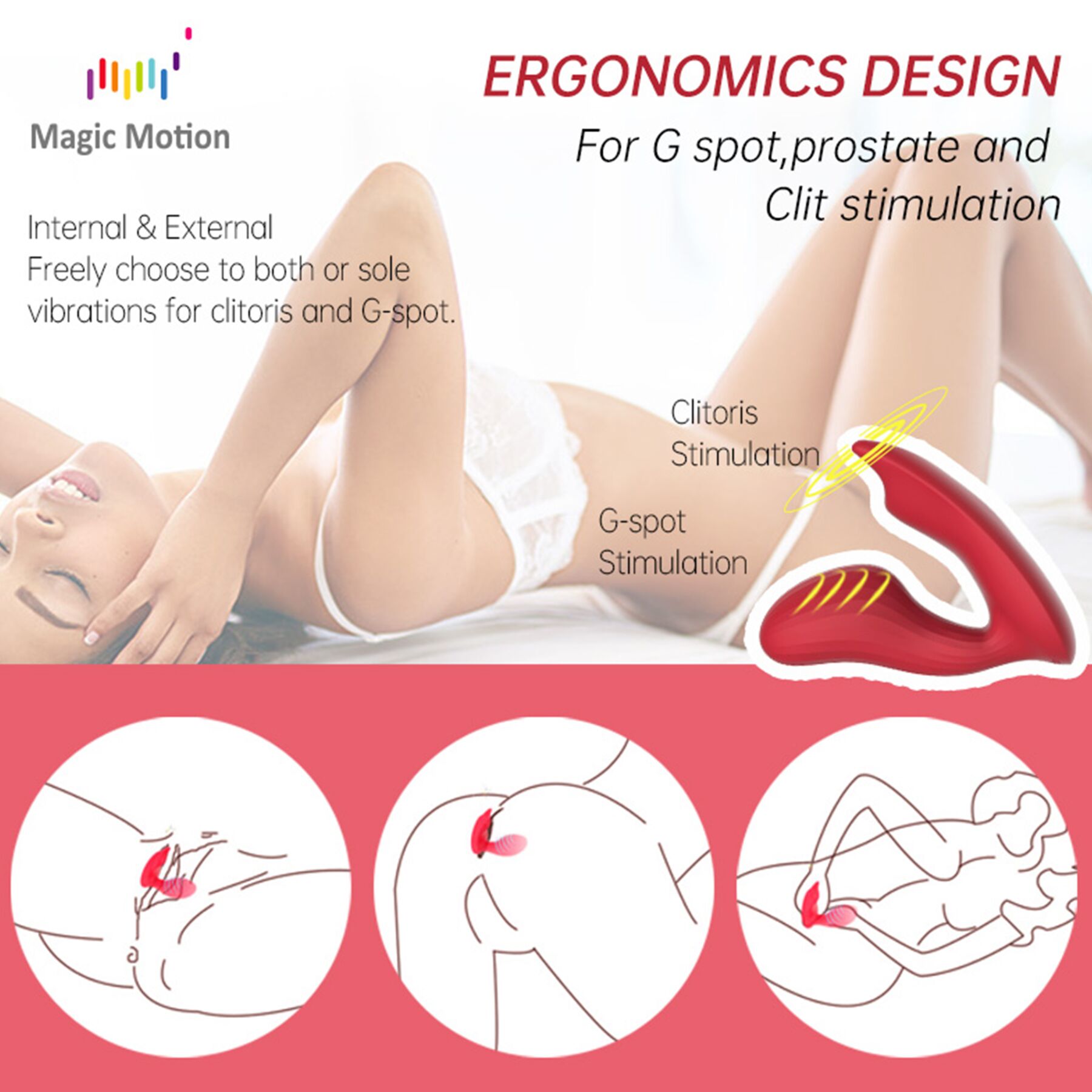 Смартвібратор Magic Motion Umi має дивовижний вигляд та виготовлений з урахуванням особливостей жіночої анатомії. Попри жорсткий корпус такий дизайн забезпечує правильне розташування, а гнучке з’єднання частин дає змогу підлаштувати його під себе. Так, потовщення на ввідній частині створює приємне відчуття заповненості й чітко потрапляє на точку G. Водночас зовнішня частина має опуклість для цілеспрямованої стимуляції клітора й щільно прилягає до тіла, так що задоволення не змусить себе чекати! Ну і, звичайно, цей вібратор точки G від меджик моушен надзвичайно функціональний.