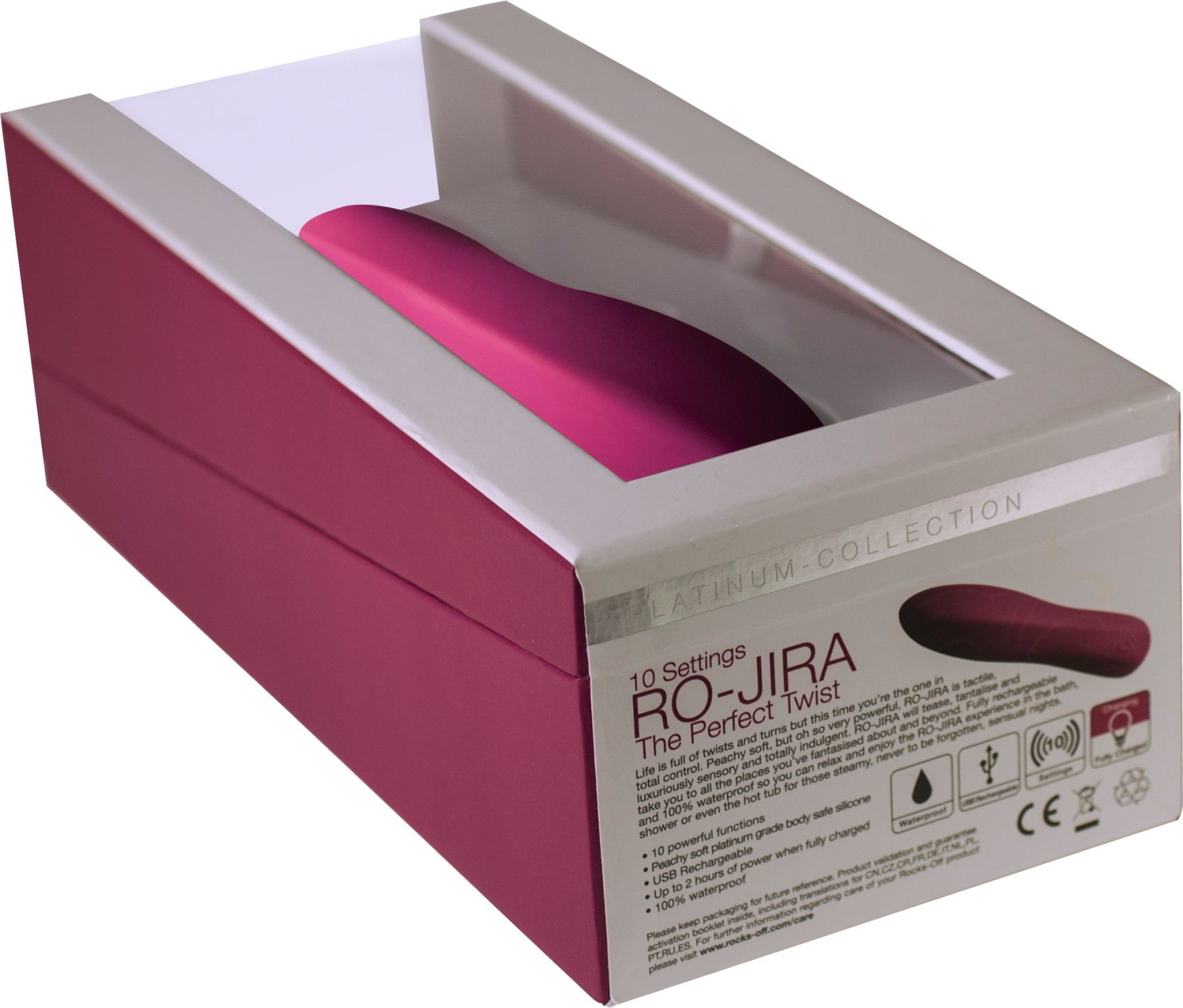 Анатомічна форма довжиною 18 см дозволить відчути максимум задоволення від контакту з вібратором. Має 10 режимів вібрації, які подарують чуттєву насолоду. Повністю перезаряджається і 100% водонепроникний, так що ви можете розслабитися і насолоджуватися RO-Jira у ванній, душі або джакузі спекотними та чуттєвими ночами.