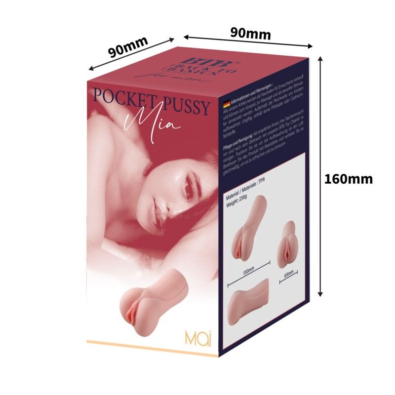 Мастурбатор-вагіна MAI Pocket Pussy Mia Flesh виготовлений з м’якого, приємного на дотик матеріалу TPR, його довжина всього 13 см, а ширина — 6,5 см. Завдяки матеріалу, з якого виготовлений мастурбатор, він добре тягнеться, не стискаючи і не доставляючи дискомфорту, тому дуже добре підійде на член середнього діаметра, м’яко обволікаючи і стимулюючи. Рельєфна поверхня перешкоджає ковзанню мастурбатора у руці.
