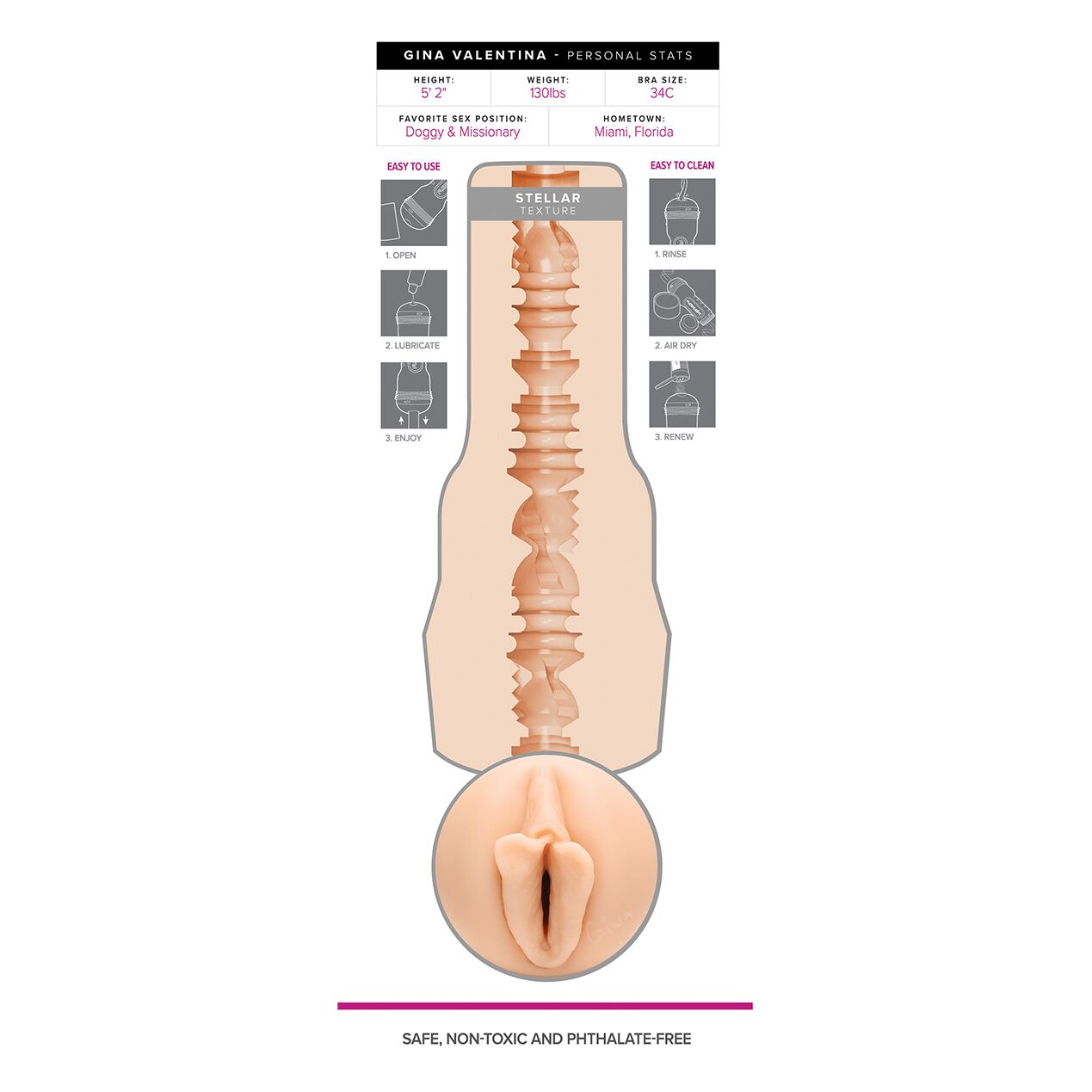 У кожного чоловіка своя еротична фантазія, і якщо вас заводять мініатюрні гарячі латиноамериканки, тоді варто купити мастурбатор Fleshlight Girls: Gina Valentina — Stellar. Унікальний матеріал рукава Superskin, можливість регулювати силу всмоктування та анатомічно точна імітація вагіни молоденької, але вже дуже досвідченої красуні Джини Валентина, подарують вам максимально реалістичні відчуття та незабутні оргазми. Власниця шикарного тіла, бездоганної фігури та засмаглої гладенької шкіри, Джина за свою коротку порнокар’єру встигла знятися в понад 300 фільмах і завоювати велику армію шанувальників. У 2017 році вона була номінована на премії AVN та XBIZ у категорії «Найкраща нова актриса», у серпні того ж року була обрана Penthouse Pet журналом Penthouse. У 2020 році Team Skeet — мережа сайтів для дорослих на підліткову тематику 18+ від Paper Street Media, оголосила Джину Валентину своєю лютневою «All-Star».