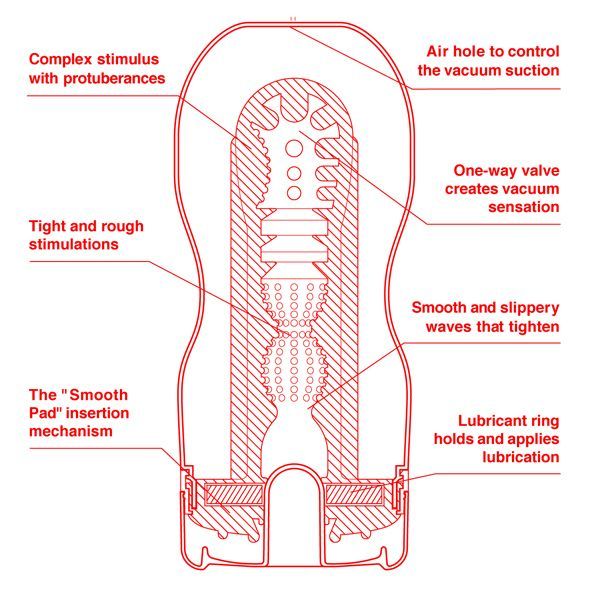 Спеціальні клапани для створення високого тиску вакууму створюють найбільш реалістичні відчуття як при справжньому оральному сексі (мінеті). Поєднання великих і малих виступів у середині трубки з жорстким рельєфом при вході принесе вам велике задоволення.
