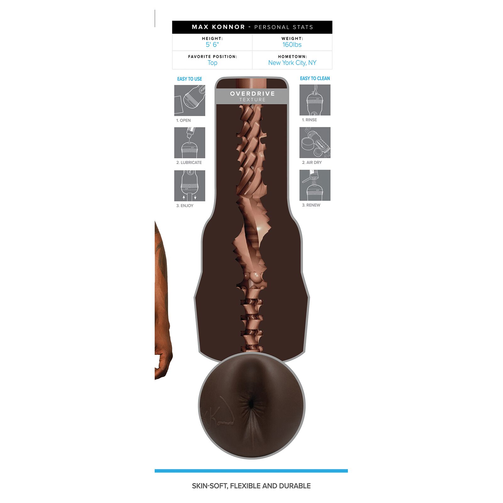 Рукав мастурбатора виготовлений з надм’якого матеріалу, який на дотик нагадує шкіру. Рукав мастурбатора-дупки Fleshjack Boys: Max Konnor Overdrive — це три камери насолоди. У першій, найвужчій камері, розташовані ряди стимулювальних намистин. У середній камері є гладкі та звивисті ребристі хвилі, влаштовані під кутом до загального каналу. Стінки третього відділу вкриті короткими чотиригранними нитками, які різко обриваються одна за одною, залишаючи кутасті зрізи. Ці м’які грані, ребра, намистини й кути роблять сеанс мастурбації яскравим і наповненим неймовірними відчуттями.
