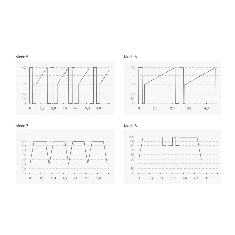5 режимів електростимуляції: рівномірні поколювання, поколювання з чергуванням інтенсивності, рівномірна пульсація (імпульсний струм), пульсація різної інтенсивності, чергування поколювання та пульсації;