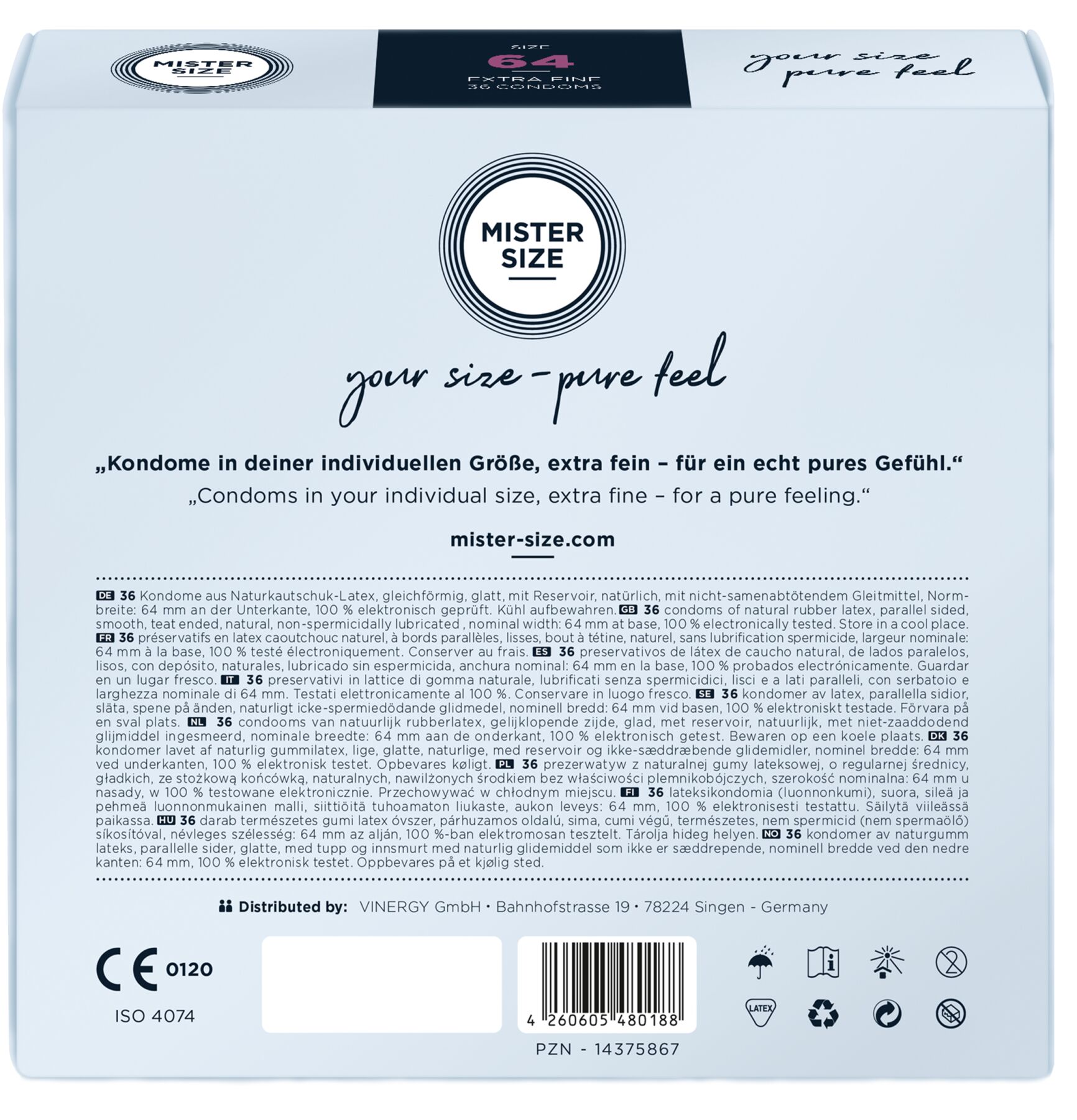 Презерватив без презерватива — лише природні відчуття під час близькості! Пропонуємо купити презервативи Mister Size – pure feel – 64, виготовлені з найтоншого каучукового латексу. Товщина стінок презерватива всього 0,05 мм, водночас він досить міцний, щоб не порватися у відповідальний момент, що забезпечує надійний захист від небажаної вагітності та ЗПСШ. Презервативи покриті силіконовою змазкою, легко надягаються та забезпечені зрозумілою ілюстрованою інструкцією. Головне, правильно дібрати розмір та насолоджуватися якісним сексом!
