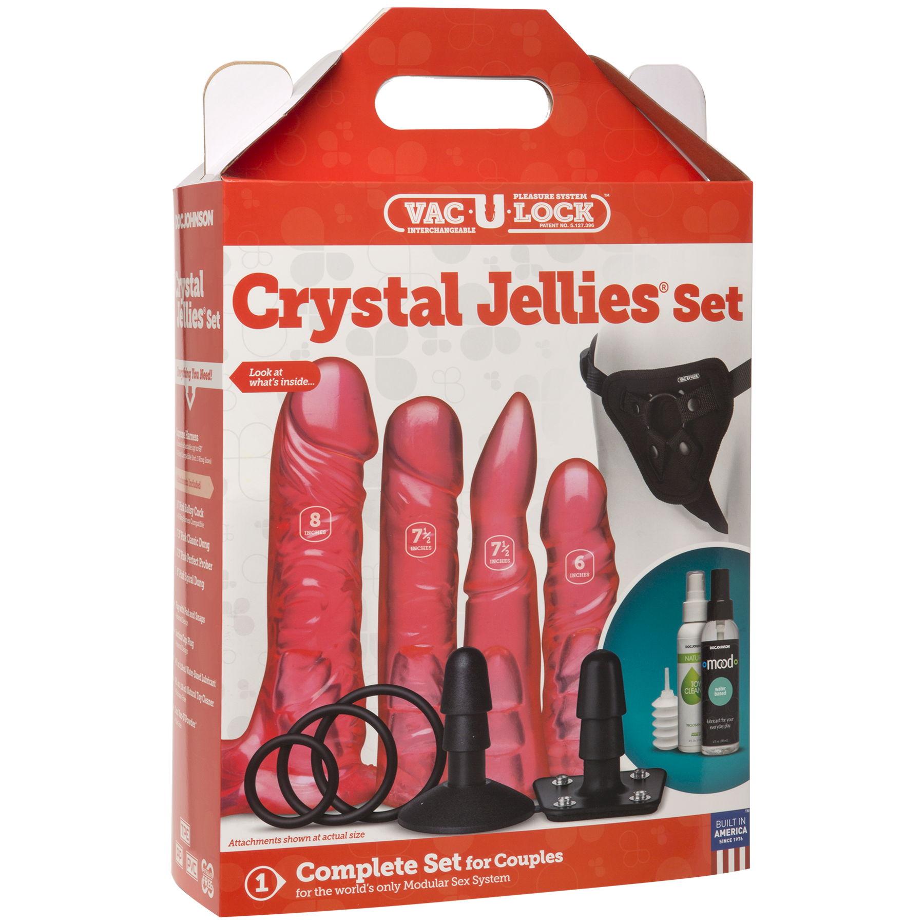 Crystal Jellies Set від Doc Johnson – це відмінний набір, який підійде як для новачків, так і для досвідчених користувачів. У наборі Ви знайдете 4 фалоімітатори різних розмірів, 2 кріплення на присосці і засувках, регульовані трусики, 3 змінних кільця і ​​засоби по догляду за іграшками.