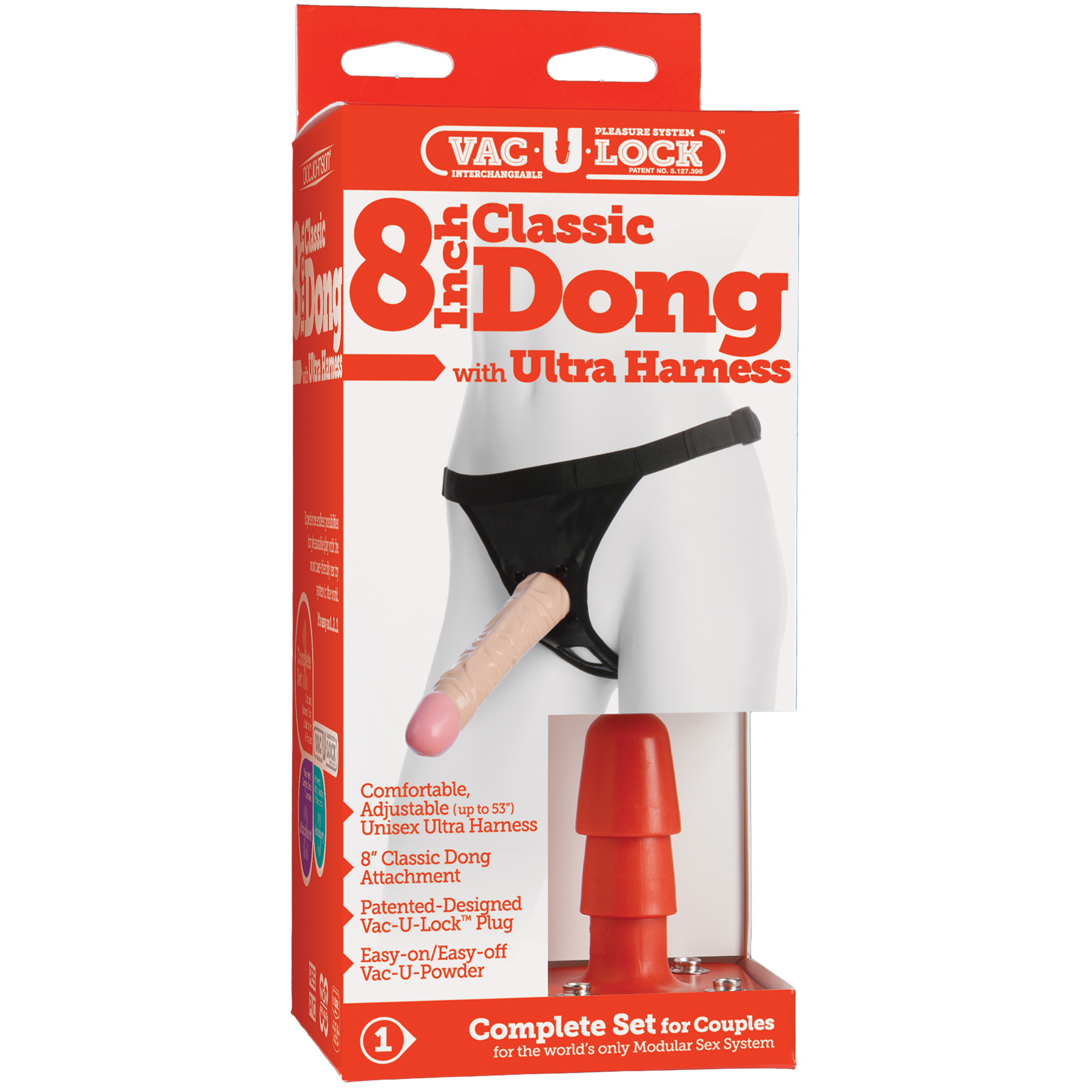 Vac-U-Lock 8 Classic Dong Ultra harness – страпон з рельєфною насадкою, тілесного кольору. Страпон, відмінно підійде для того, щоб урізноманітнити інтимні ігри, як в гетеросексуальних, так і в лесбійських парах. Насадка має дивно рельєфну поверхню для насиченою стимуляції. Виготовлений фалос з безпечного та приємного на дотик матеріалу полівінілхлориду. При виготовленні використовувалася антибактеріальна технологія Sil-A-Gel. Регульовані вінілові трусики зручні й універсальні. Особливість продукції цієї компанії в тому, що для одних трусиків Ви можете вибрати кілька різних насадок.