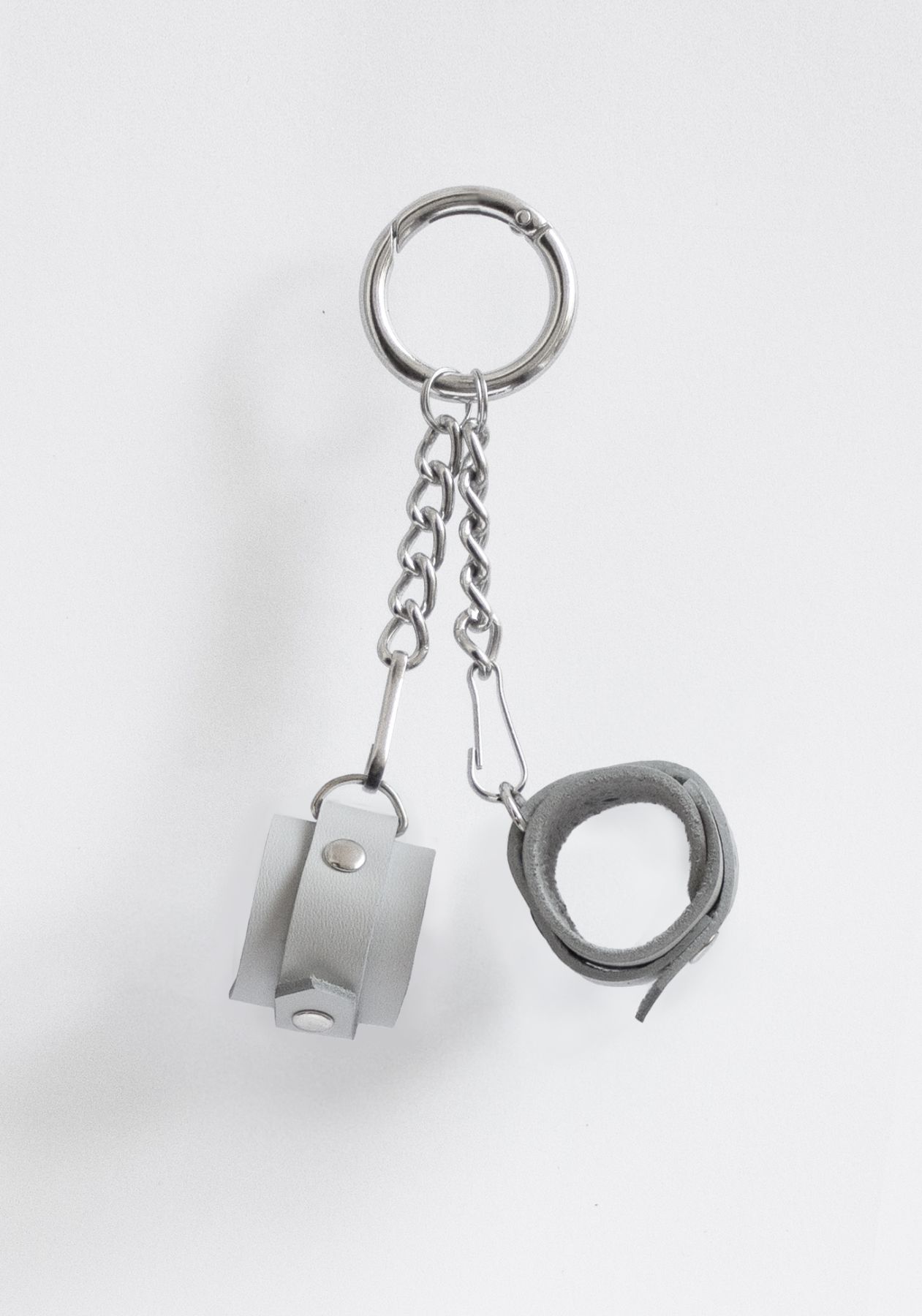 Міні-наручники з натуральної шкіри рослинного дублення, прикрашені хольнітенамі (заклепками). Кожен наручник кріпиться до основного кільця-карабіну ланцюжком і міні-карабіном, тому можна носити тільки один наручник, а другий – подарувати своєму партнеру у якості символу.