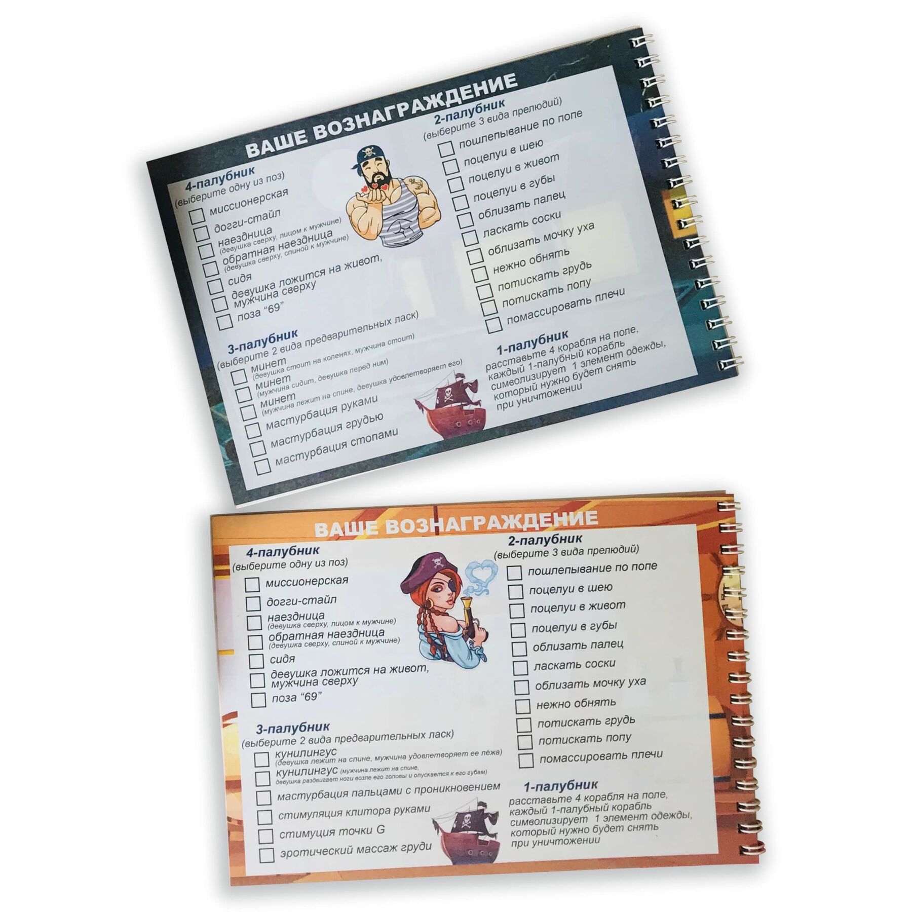 Як грати в еротичну гру "Морський бій. Постільна версія "? Кожен бере свій блокнот (блокноти відрізняються переліком попередніх ласк) і на своєму полі розміщує кораблі: чотири однопалубних, три двопалубних, два трипалубних і один чотирипалубний. Далі грайте в звичайний морський бій. Той, хто збиває однопалубний корабель, обирає елемент одягу, який противнику потрібно зняти (1 корабель = 1 елемент одягу). За повністю збитий двопалубний корабель доведеться "розрахуватися" ласкою-прелюдією (наприклад, поцілувати в шию, потискати попу і т.д., на вибір, 1 корабель = 1 прелюдія). Збивши трипалубний, ви зможете вимагати у противника попередню ласку: мінет для чоловіка, кунілінгус для жінки або мастурбація руками (1 корабель = 1 ласка). Ну а той, хто повністю зіб'є чотирипалубний, буде обирати позу для сексу: догі-стайл, місіонерська, наїзниця, 69 або іншу. Так гра перейде в гарячу інтимну близькість!
