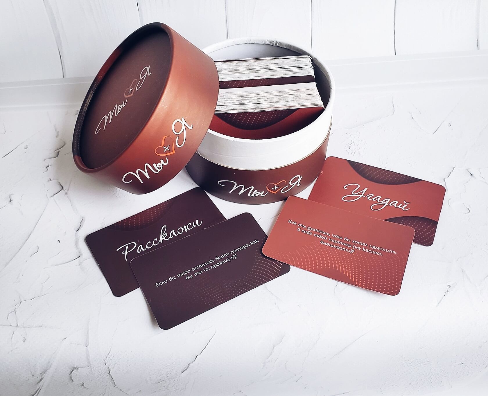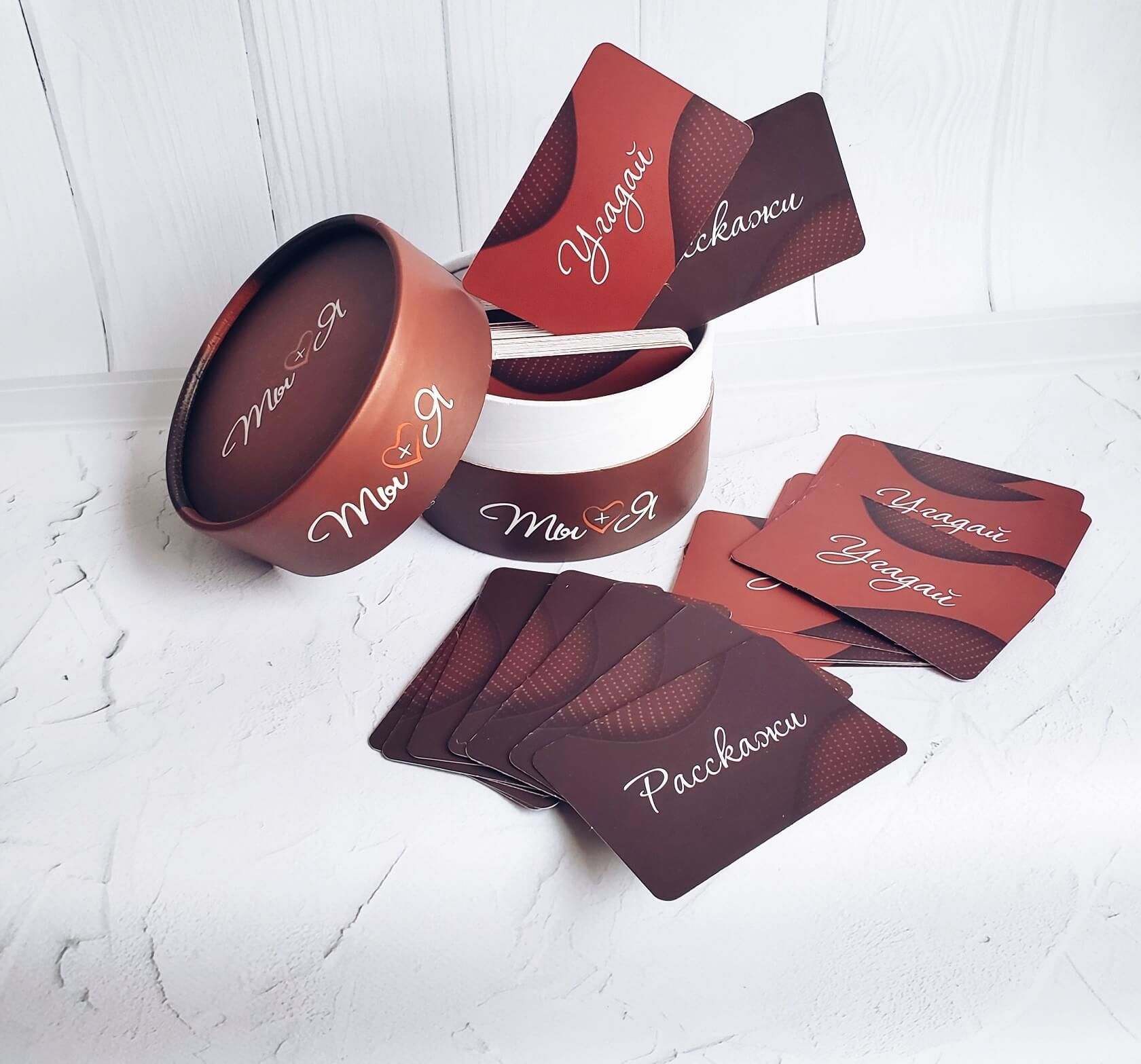 Стисло про правила: Тягніть картки з різних колод і за чергою відповідайте на запитання. Витягли картку «Розкажи» — відповідаєте на запитання, яке стосується вас. Дісталася картка «Вгадай» — намагаєтеся правильно відповісти про вашого партнера.