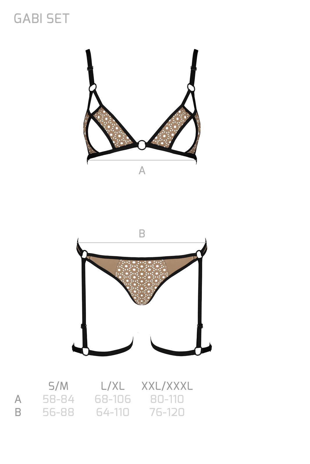 Пропонуємо купити сексуальний комплект спідньої білизни GABI SET, створений польським брендом Passion. Надзвичайно приємна на дотик тканина бежевого кольору обшита тонкими бретельками чорного кольору. Комплект білизни запропонований у розмірі L/XL.