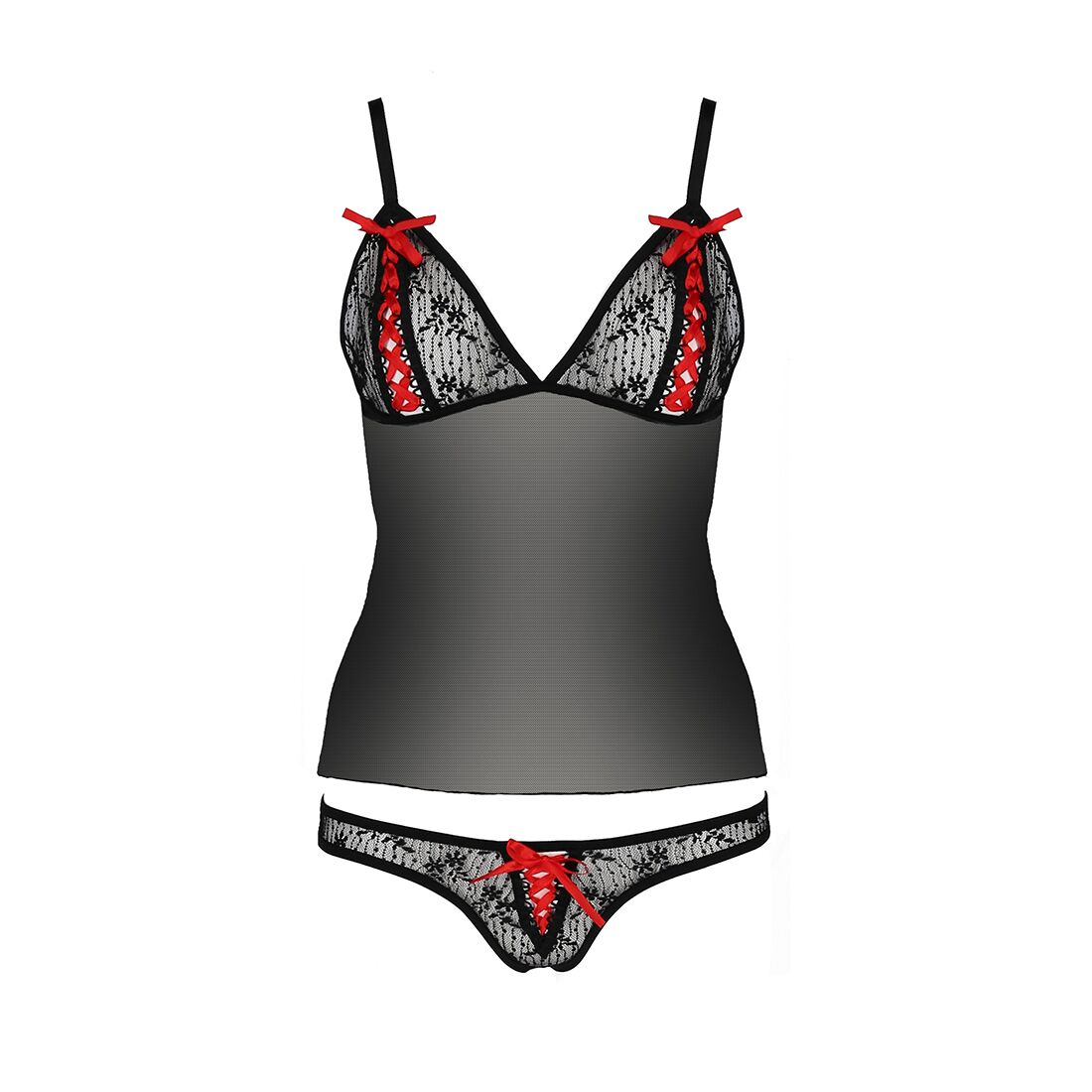 Комплект виготовлений з якісного матеріалу, який легко переносить прання. Бретелі плоскі і регулюються по довжині для максимально чіткої посадки по фігурі. Зверніть увагу на яскраві акценти – розрізи з червоною шнурівкою. Вони викликають бажання доторкнутися, розв'язати всі стрічки і продовжити побачення в максимально інтимному спілкуванні.