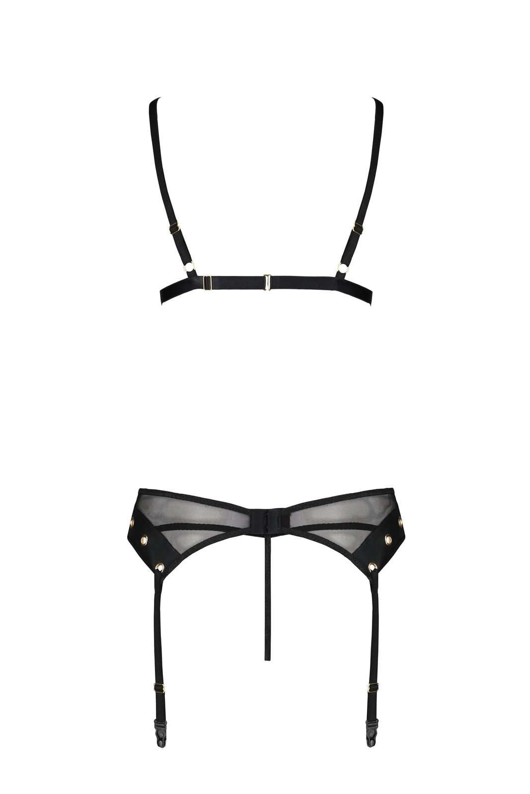 Оголюйте красу й наготу власного тіла, одягнувшись у цю білизну Passion NESSY SET. Комплект точно знайде своє місце у вашій колекції розкішного сексуального вбрання. Бюстгальтер, бретелі якого можна регулювати, м’яко підіймає бюст і робить акцент на його округлості. Для виготовлення чашок використана прозора сітка, доповнена шкіряними деталями та зав’язками. Роль прикрас грають акуратні заклепки. Пояс для панчіх підкреслить красу ваших сідниць і виділить лінію стегон. Ваш образ вийде неймовірно чуттєвим та жіночним. Ви станете впевненішими у своїх силах, тож ця ніч буде спекотною.
