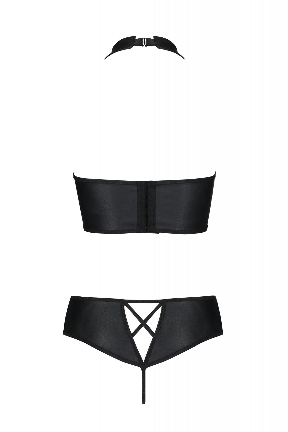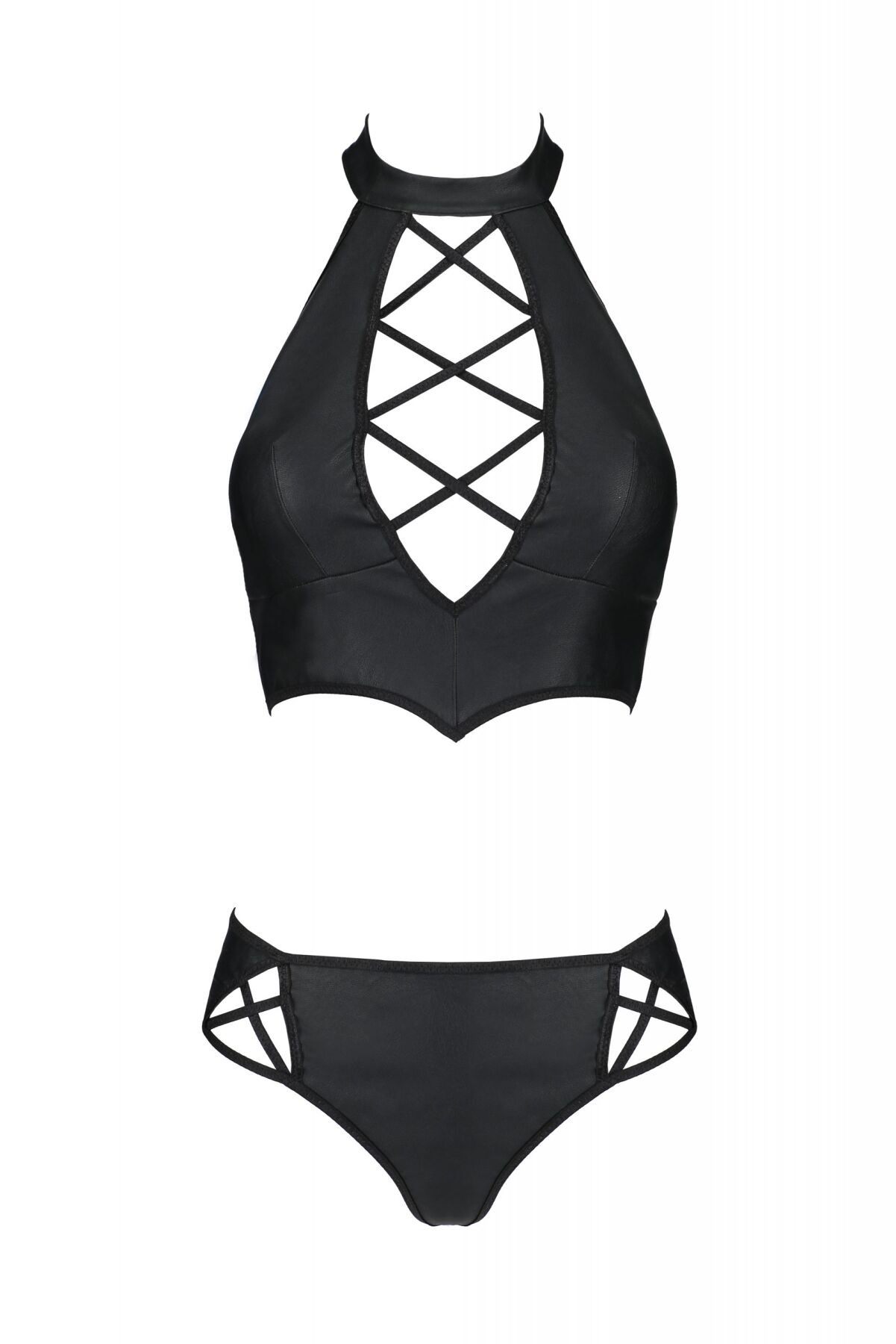 Сміливий комплект з екошкіри Passion Nancy Bikini 4XL/5XL, допоможе розкритися та випустити на волю вашу дику нестримність. Завдяки красивій формі декольте, жорстким кісточкам і цікавій шнурівці, ліф піднімає груди, роблячи їх ще більш привабливими. Елегантний високий комір і відкрита спинка — привертають увагу до тендітних плечей та витончених ручок. Трусики з гарними вставками у вигляді переплетень підкреслюють апетитні сідниці та роблять попку привабливішою. Еластична тканина ідеально сідає по фігурі та дозволяє шкірі дихати. Ви можете надіти таке еротичне вбрання під звичайний одяг, а можете доповнити його панчохами та туфлями на високих підборах, щоб додати пристрасть у ваш романтичний вечір.