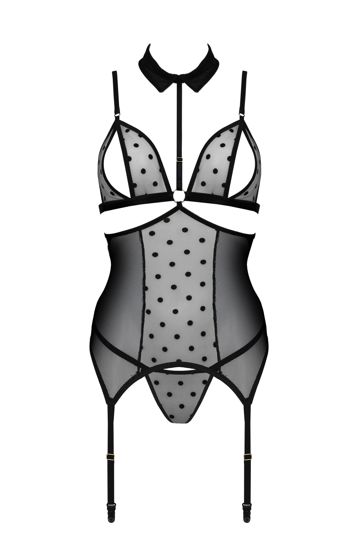 Модель боді з відкритими грудьми Passion DOMINICA CORSET виконана з прозорого матеріалу в горошок. Унікальний крій додає образу спокусливості, тому чоловік не зможе встояти перед вашим тілом. Плечові ремені та підв’язки регулюються, чашки комплекту м’яко відкривають соски. Просто надягніть його на себе, щоб вирушити у світ сексуальних експериментів.