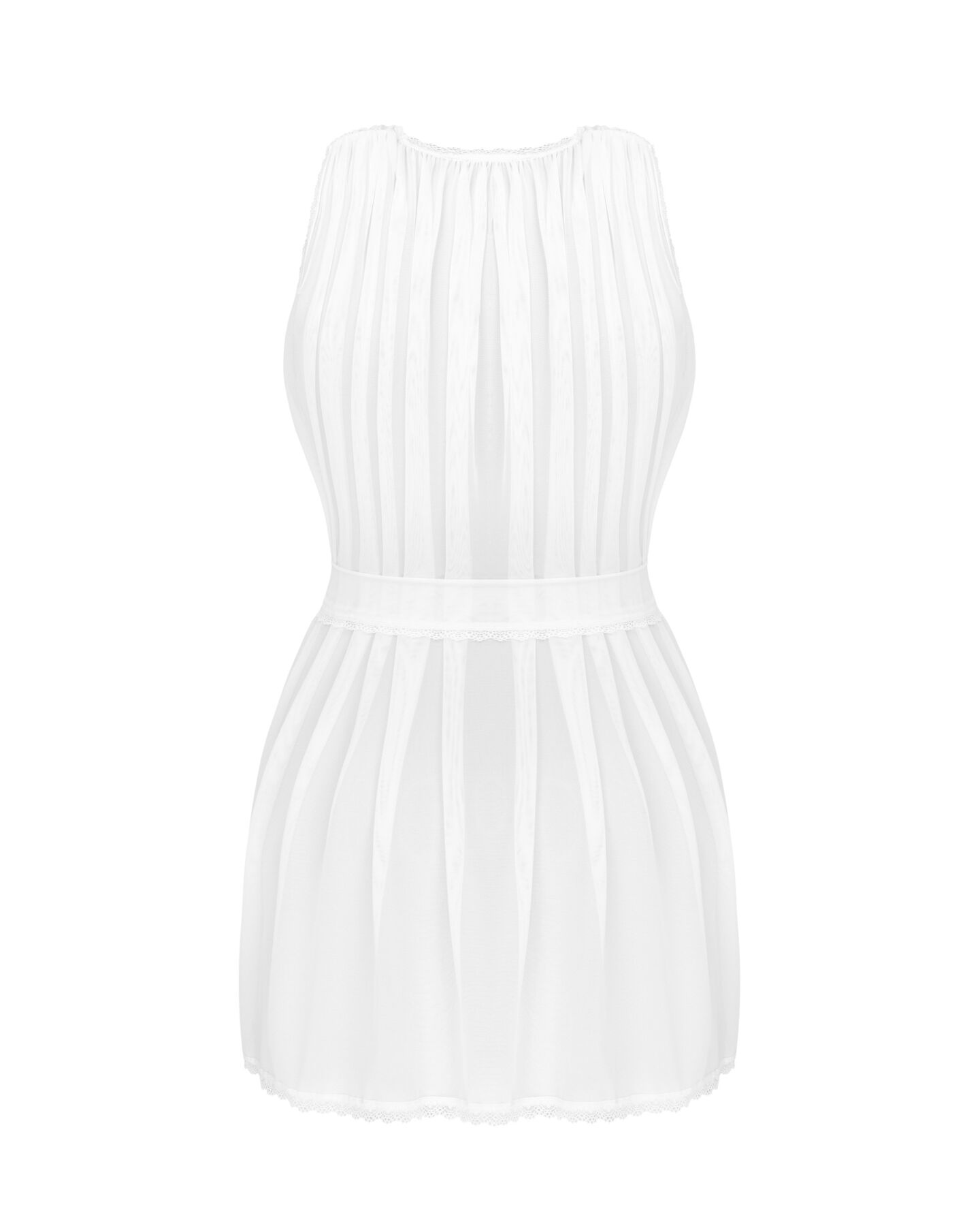 Напівпрозорий пеньюар Obsessive Heavenlly peignoir пошито з найтоншого легенького матеріалу, який лише злегка прикриває тіло, лягаючи м'якими хвилястими складками й пестячи шкіру. Пеньюар виконаний у вигляді мініхалатика з поясом і без рукавів. Поли пеньюара облямовані тонким і широким мереживом у дрібну симпатичну квіточку, що додає білизні ніжності та витонченості. Поясок підкреслює талію і не дає неслухняним полам пеньюара оголювати спокусливі частини тіла.