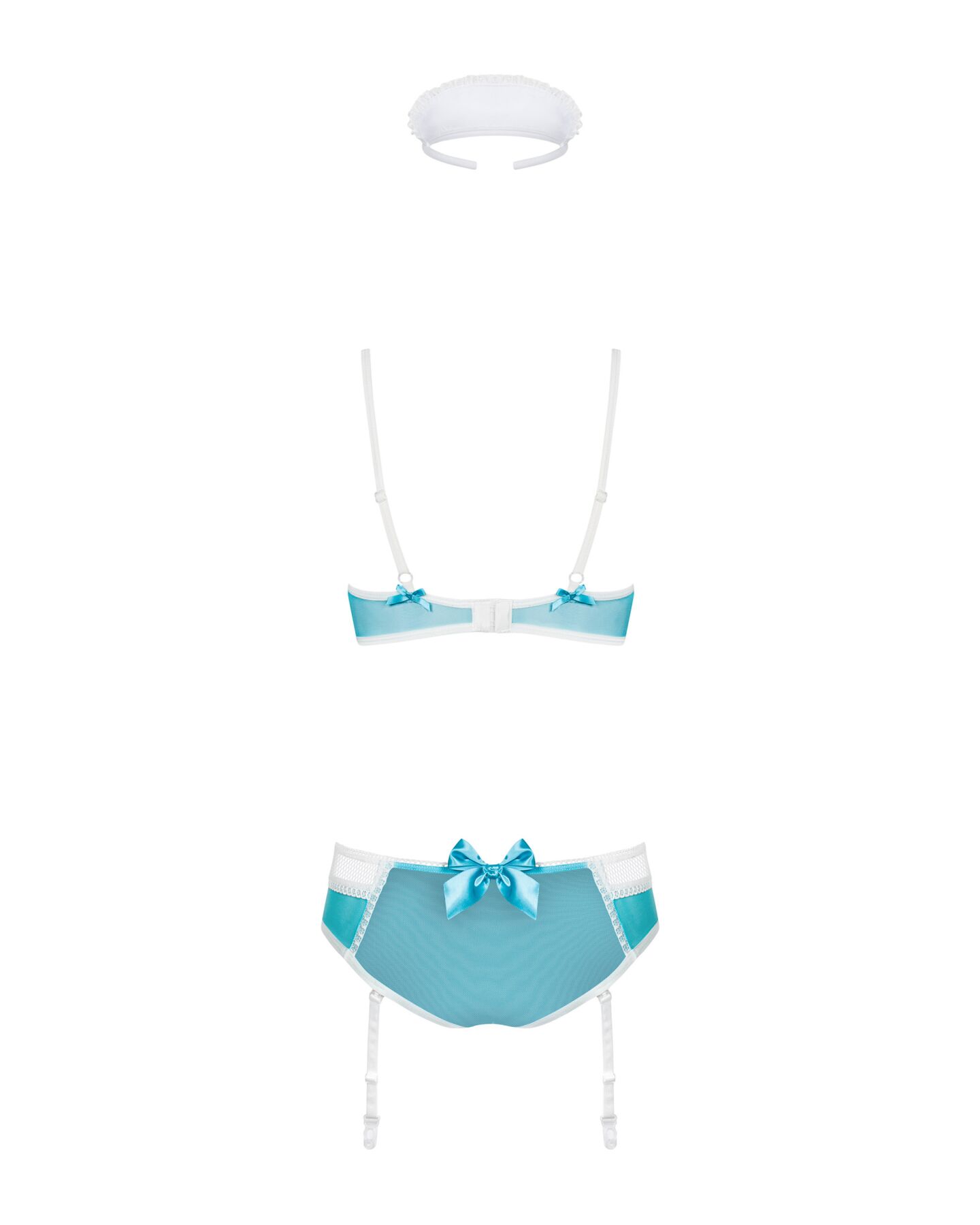 Спокусливий костюм медсестри виконаний з еластичного, приємного до тіла матеріалу небесно-блакитного кольору та білої сіточки. М’які чашки на кісточках ліфа не додають об’єму, але спокусливо підкреслюють груди. Сіточка відкриває приголомшливий вигляд на м’які форми грудей, а шнурівка між чашками нагадує, що цю частину одягу можна скоріше зняти. Бретелі бюстгальтера регулюються, позаду є багаторівнева застібка, щоб білизна села ідеальна. Трусики із заниженою талією красиво підкреслюють стегна, а шнурівка спереду та кокетливий бантик ззаду додають шарму та інтриги. Еластичні лямки для панчіх знімні та регульовані. Завершує образ матер’яно-рюшева пов’язка на голову.