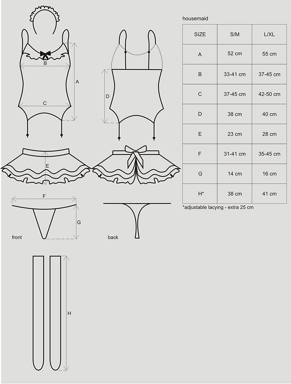 Розмір S/M: обхват під грудьми — від 66 до 82 см, обхват стегон — від 74 до 90 см, довжина топа спереду — 52 см, довжина топа по спинці — 38 см, довжина спідниці — 23 см, резинка стрингів — від 62 до 82 см, висота стрингів — 14 см.