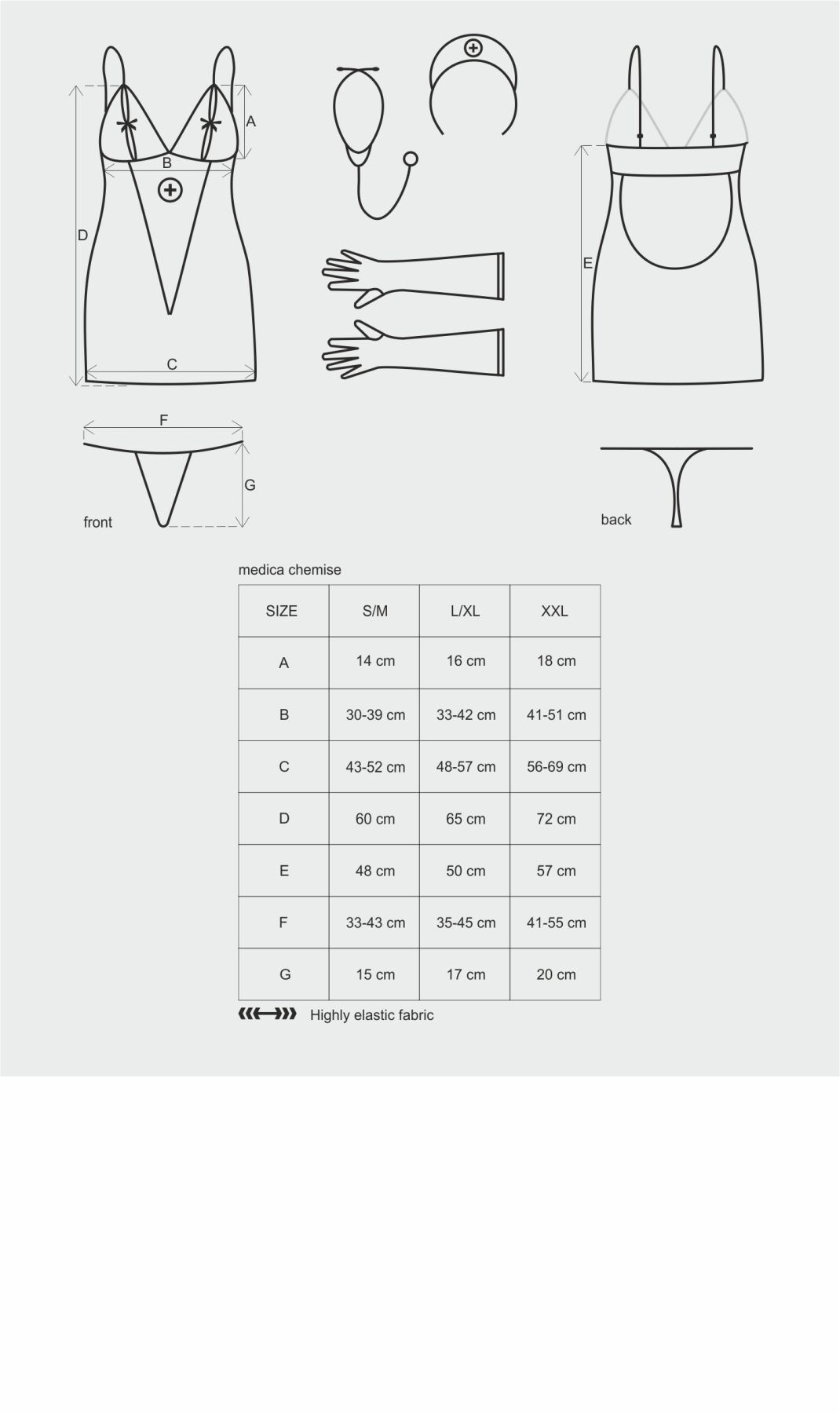 Сорочка цього чудового костюма виконана з білого мереживного матеріалу. Великі квіти та симпатичні завитки красиво прикривають оголене тіло, вигідно контрастуючи із кольором шкіри. Кожна трикутна чаша ліфа складається з двох частин — мереживної та сітчастої, у щілину між якими видно сосок та ореолу. Грайливий червоний бантик, який можна розв’язати, привертає увагу до цієї пікантної подробиці. Регульовані бретелі гарантують ідеальну посадку сорочки. клиноподібна деталь із дрібної сітки вшита в сорочку спереду. Вона красиво лягає на животик і ніби вказує напрямок до ніжного, спраглих пристрасті лону. Відкрита спинка і крихітні стрінги виглядають чудово. Мереживні рукавички щільно облягають руку і є додатковим, цікавим аксесуаром. Дотики пальців у рукавах матерчатих до розпаленого тіла партнера можуть бути неймовірно збуджуючими. А якщо залучити фантазію та провести огляд його та своїх найінтимніших місць, то цю ніч ваш коханий точно запам’ятає надовго. Стетоскоп та шапочка медсестри чудово доповнюють образ.
