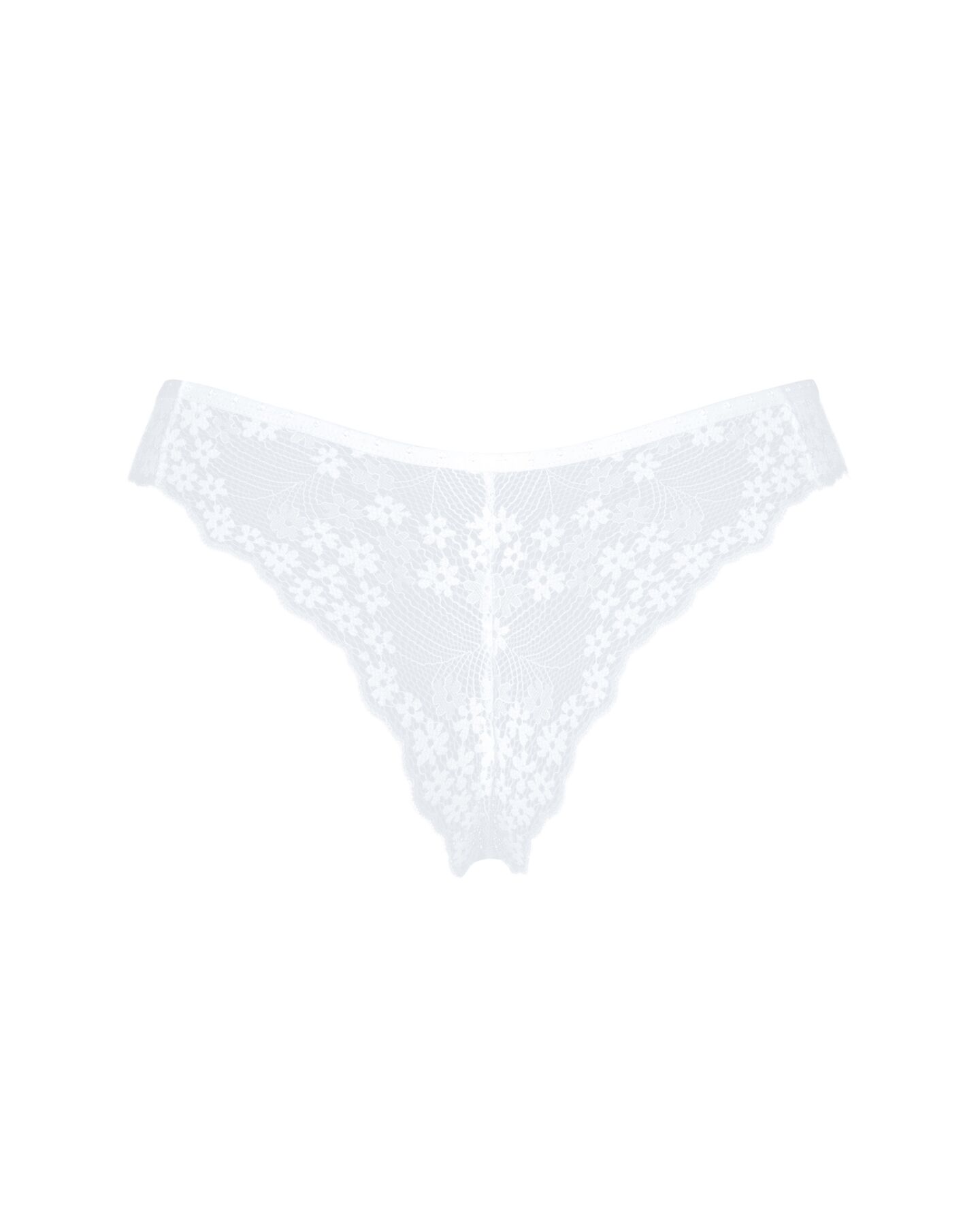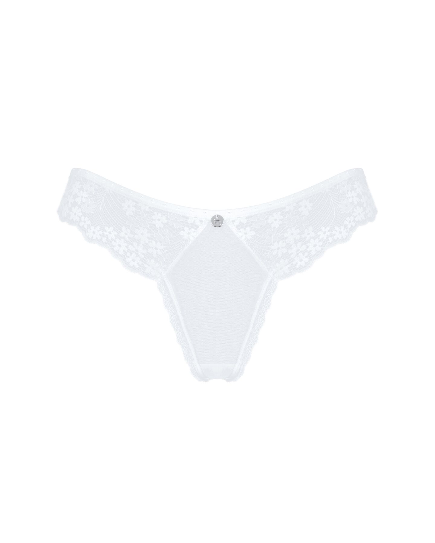 Трусики пошиті з найтоншого еластичного матеріалу й широкого ніжного мережива з квітковим малюнком. V-подібний крій візуально подовжує ніжки й спокусливо залишає сідниці оголеними. Сріблястий медальйончик з логотипом виробника привертає увагу до білизни та змушує серце битися сильніше. Одягніть ці трусики з пеньюаром або поясом для панчіх або одягніть тільки їх і нічого більше, і будьте впевнені — ви справите справжній фурор цієї ночі.