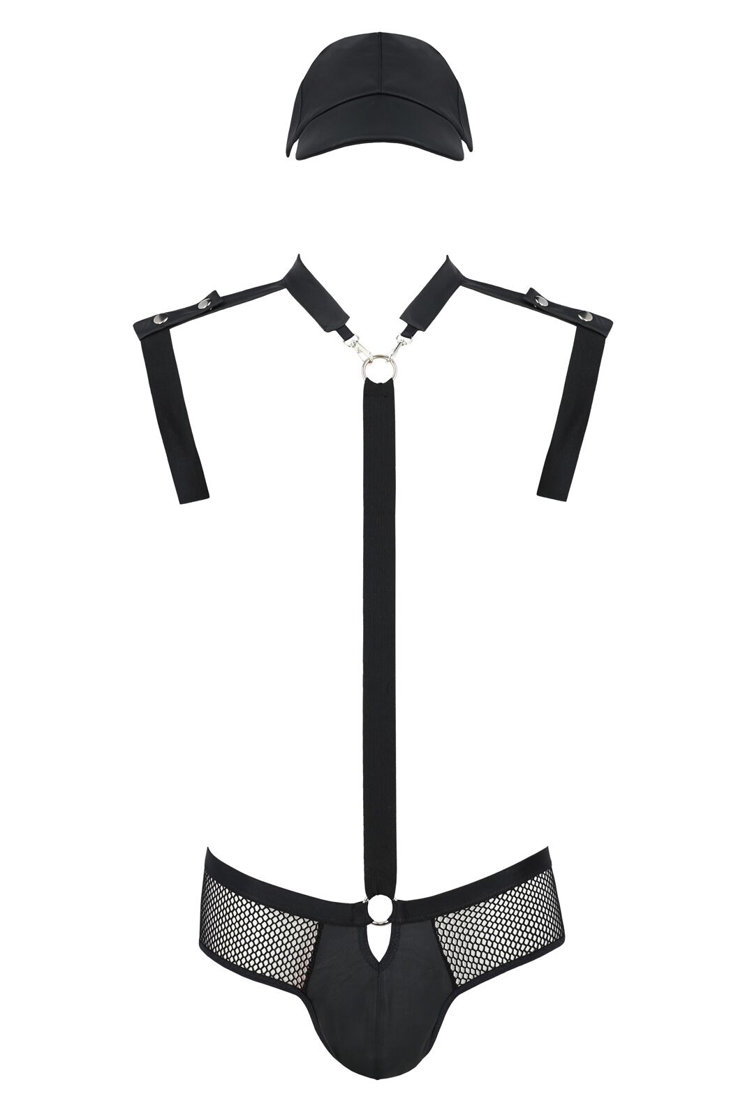Цей стильний комплект, пошитий з м’якої екошкіри й широких резинок, оцінять прихильники сексуальних ігор і любовних пригод. Трусики-сліпи виконані з екошкіри та сітки, сідниці відкриті. М’якенькі ремені красиво лягають на тіло, підкреслюючи мужність і пристрасність, а псевдопогони та кепка навіюють думки про сильного поліцейського. А ось кнопки, кільця й карабіни нагадують, що сильний поліцейський може бути ще й надзвичайно сексуальним.
