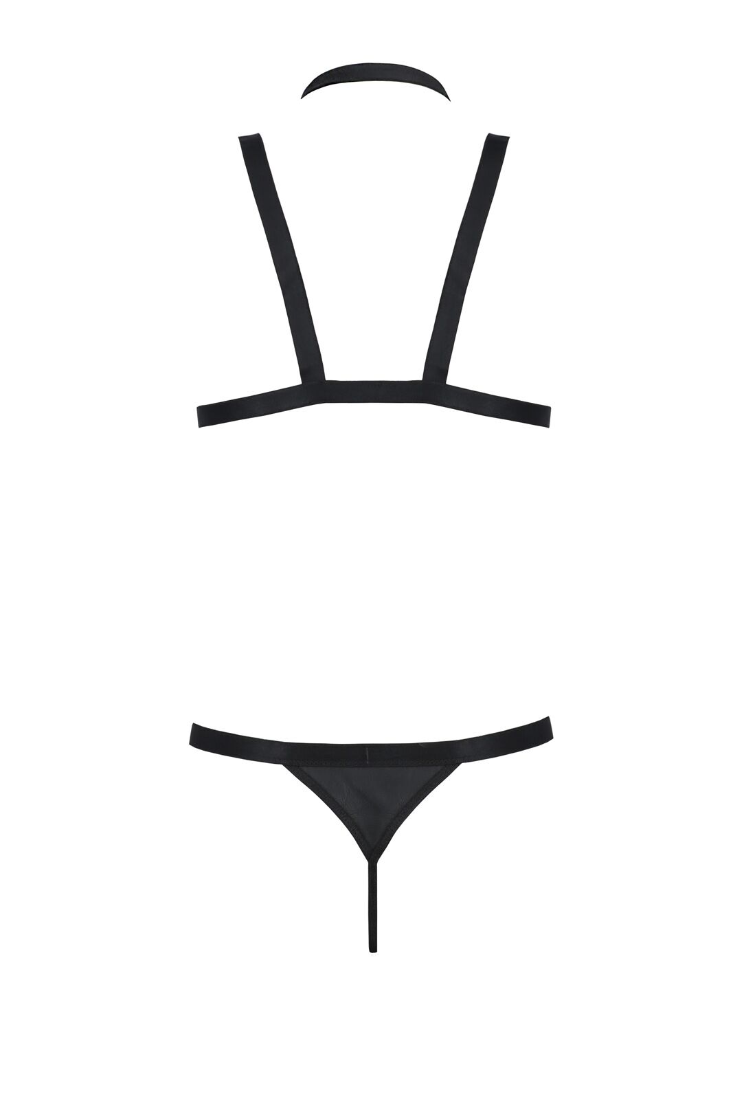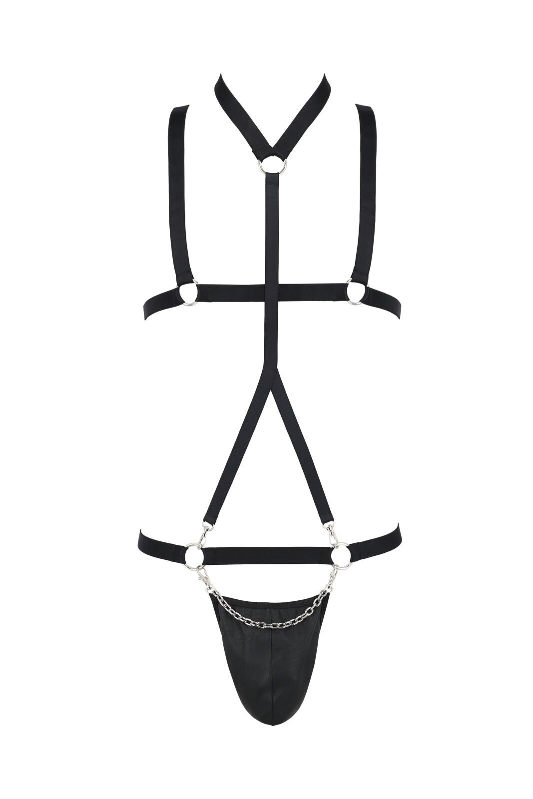 Комплект чоловічої білизни зі стреп Passion Set Andrew пошитий із м’якої екошкіри. Плечові ремені-резинки та чокер доповнені металевими кільцями та карабінами. Стринги прикрашені спереду ланцюжком і зроблені таким чином, що за потреби їх можна відстебнути, оголивши найцікавішу частину тіла. Ззаду стринги наполовину прикривають сідниці.