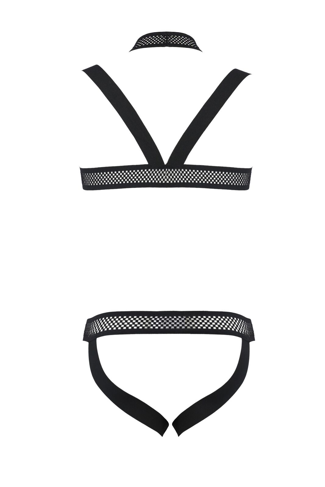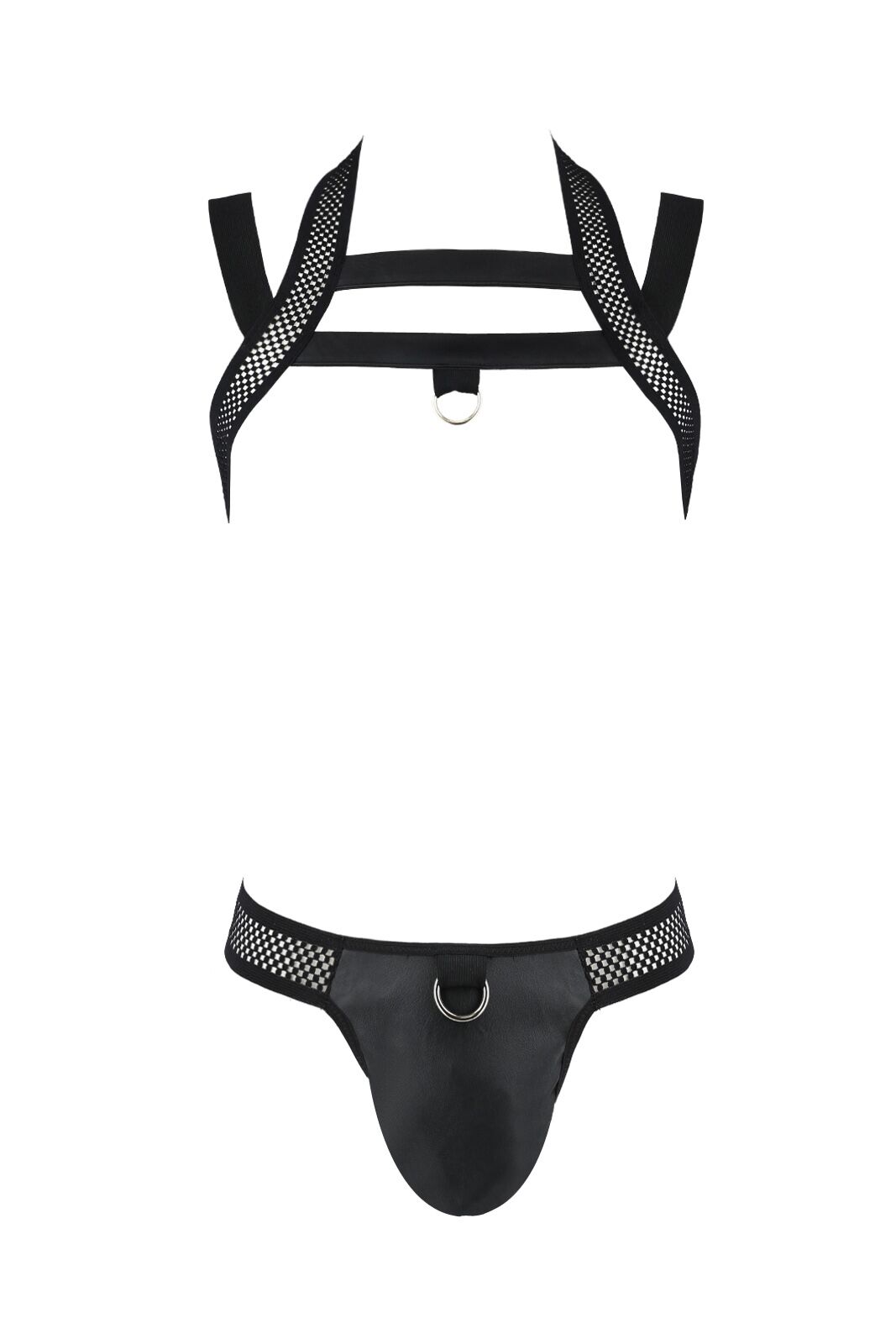 Комплект складається з трусиків із бандажами. Виконано комплект із м’якої екологічної шкіри та еластичної сітки. Ззаду труси спокусливо відкривають сідниці.
