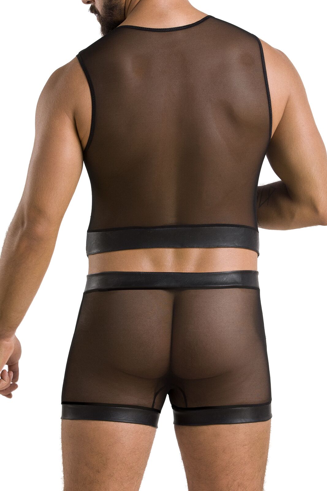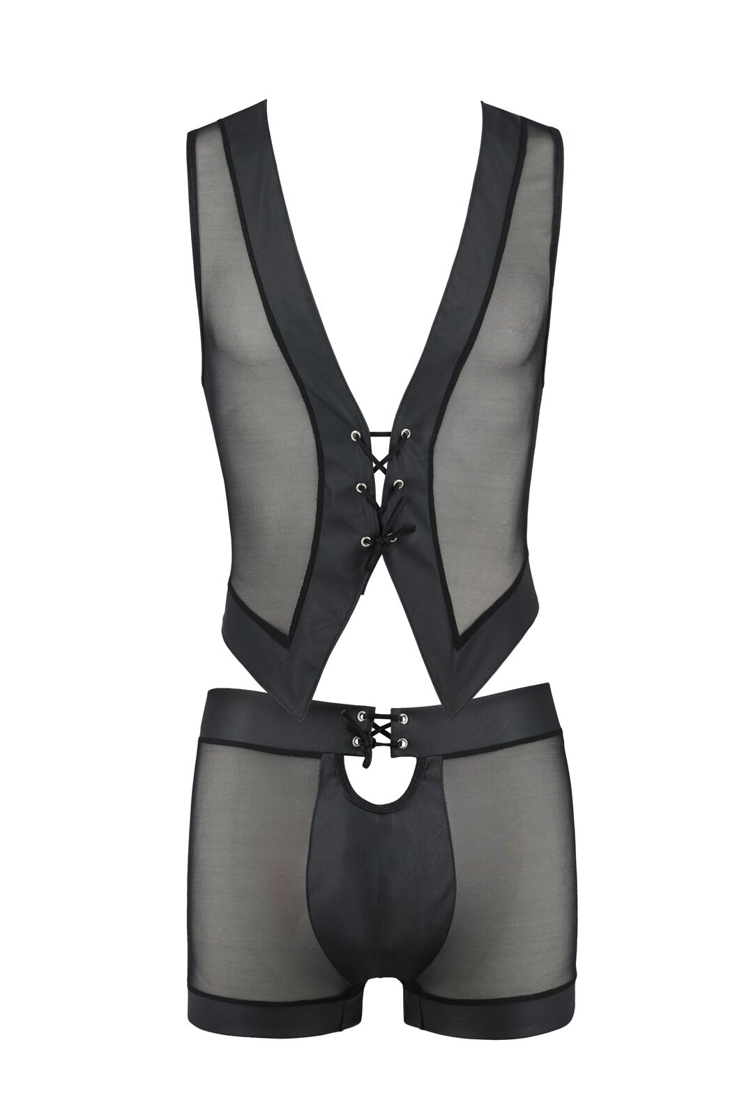Жилет і труси-шортики пошиті з м’якої міцної сіточки, яка щільно і сексуально обтягує тіло. Планки жилета й пояс боксерів оздоблені широкою смужкою екологічної шкіри, оздобленою люверсами й шнурівкою. Загальний вигляд комплекту нагадує корсет, але повірте: жорсткий і брутальний він тільки на вигляд — на дотик усі деталі м’які та легкі.