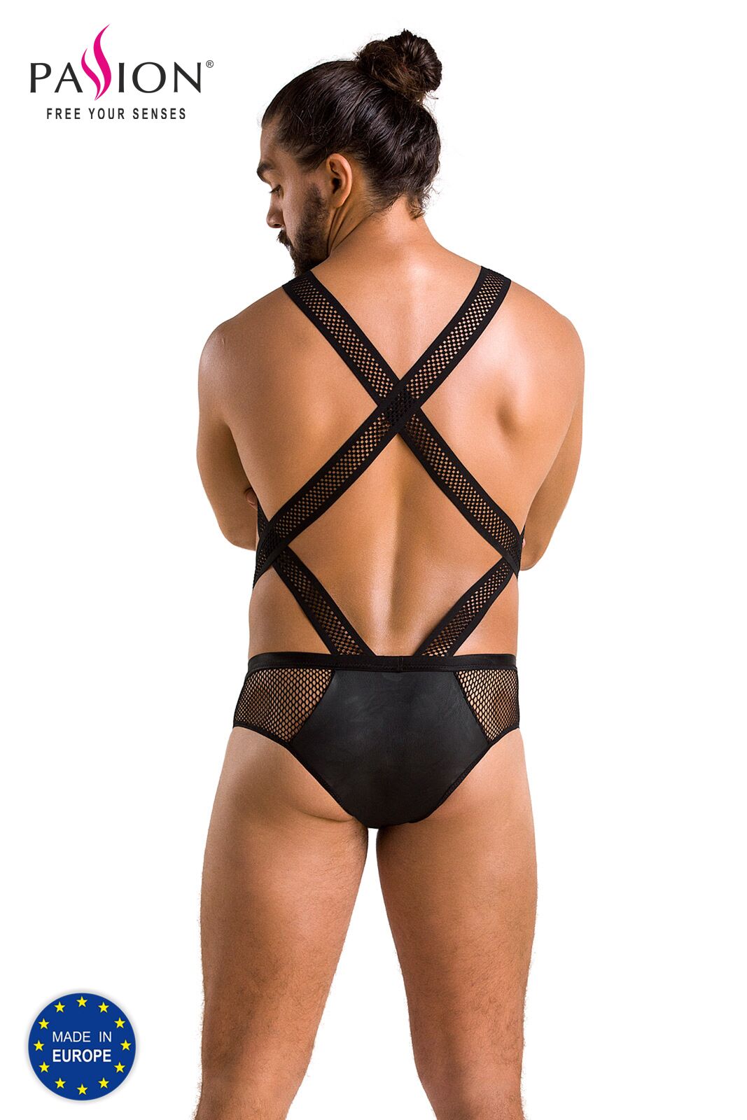 Виконано чоловіче сітчасте боді Passion Victor з еластичної великої сітки двох видів і м’якої екошкіри. Сітчасті ремені, які перехрещуються на спині, красиво облягають тіло, підкреслюючи його вигини. Трусики з тієї самої неперевершеної екошкіри й сітки грайливо прикривають сідниці, даючи волю фантазії партнеру або партнерці.