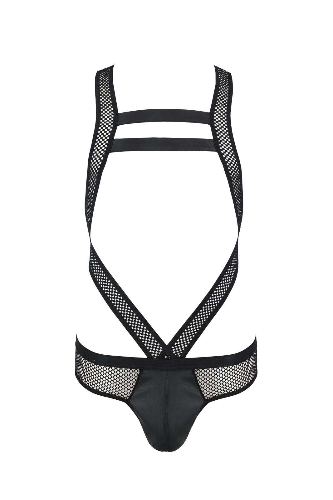 Виконано чоловіче сітчасте боді Passion Victor з еластичної великої сітки двох видів і м’якої екошкіри. Сітчасті ремені, які перехрещуються на спині, красиво облягають тіло, підкреслюючи його вигини. Трусики з тієї самої неперевершеної екошкіри й сітки грайливо прикривають сідниці, даючи волю фантазії партнеру або партнерці.