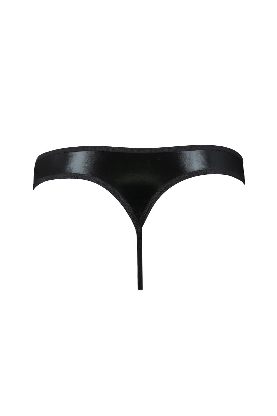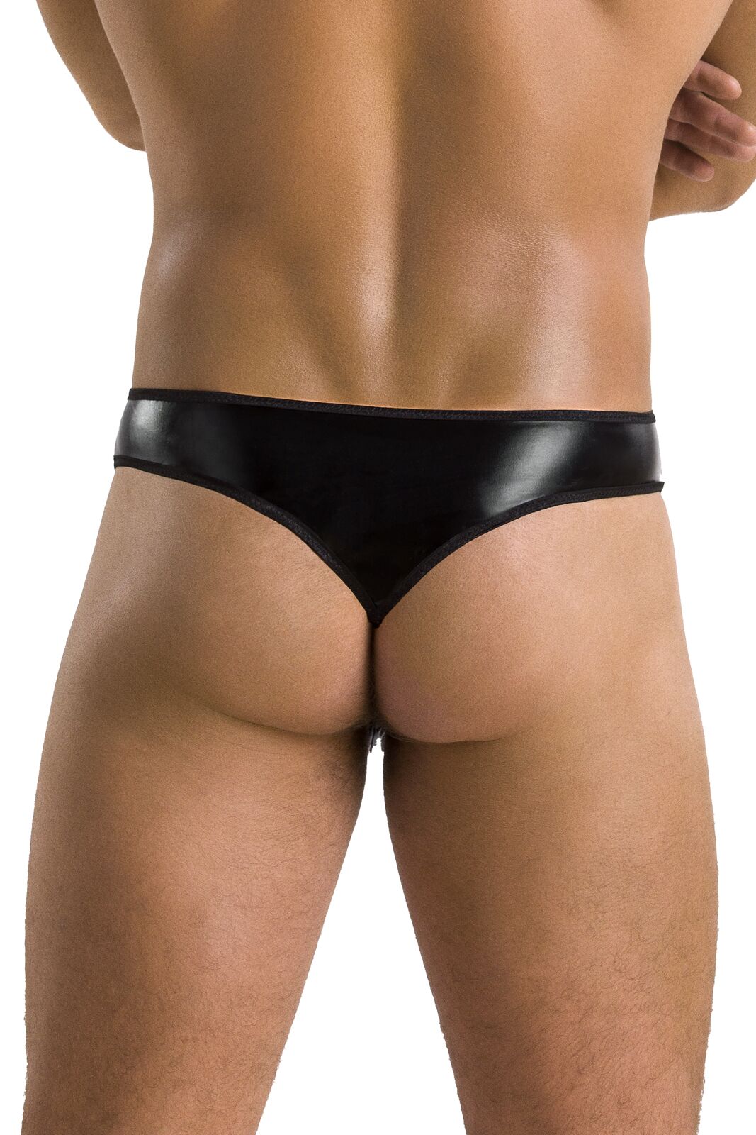 Ці стринги спереду дуже схожі на звичайні труски-плавки із заниженою талією. Але «мокрий» обтисливий ефект, грайливі вирізи з двох боків і кілечко, яке візуально скріплює три частини, натякають, що плавки ці непрості. Ззаду широка смужка «мокрого» матеріалу переходить у вузьку смужку, спокусливо оголюючи сідниці.