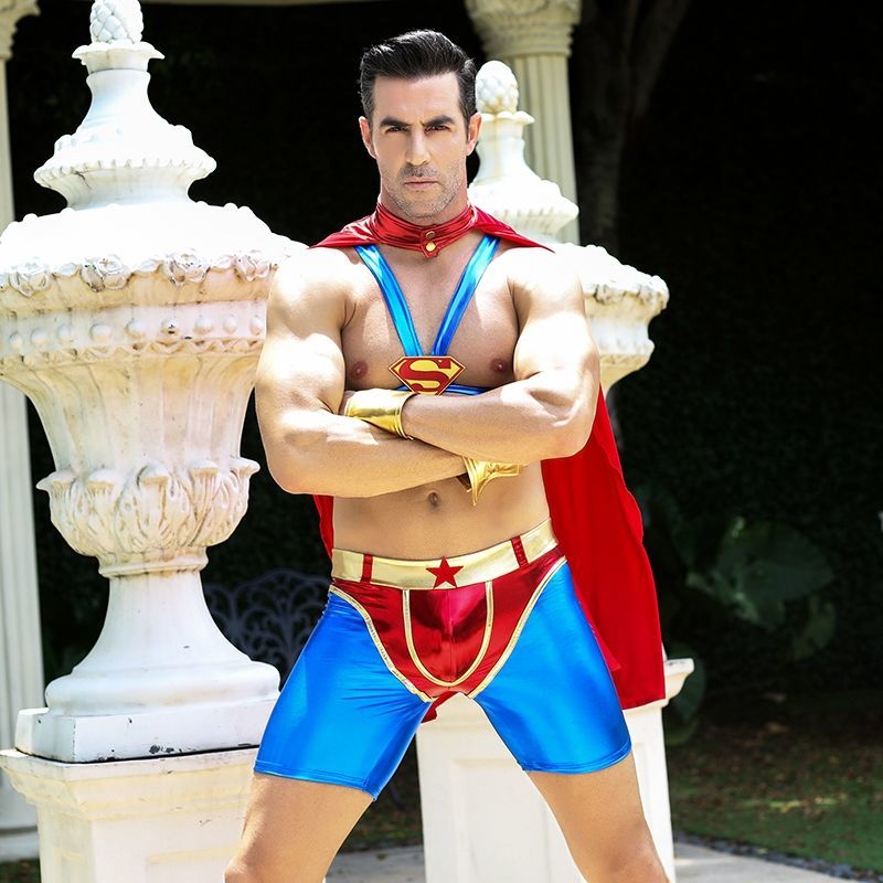 Представляємо вам яскравий костюм, який підкреслить чоловічу гідність і потужні груди завдяки особливій конструкції. Костюм складається з еластичних шорт, заклично обтягуючих і спереду, і ззаду, золотистих напульсників, покликаних підкреслити силу рук і перехресних на грудях стрічок. Червоний плащ і впізнаваний значок "S" довершують образ супергероя.