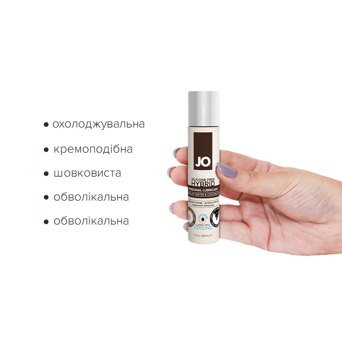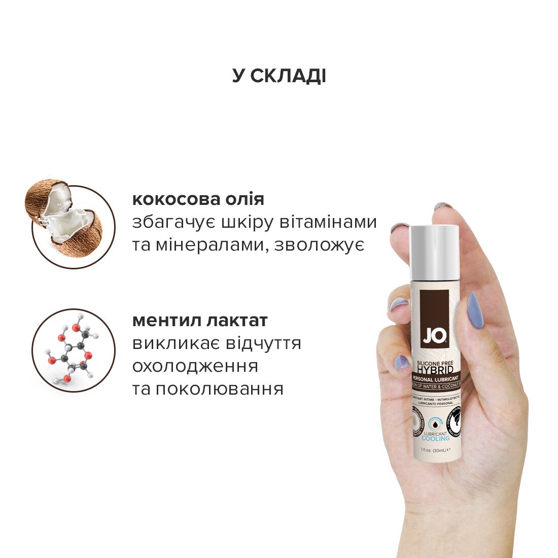 Лубрикант на комбінованій основі System JO SILICONE FREE HYBRID — COOLING з охолоджувальним ефектом засіб, що не містить силікону JO® HYBRID. Це інтимний лубрикант, що використовується як доповнення до природної змазки. Ніжна гладенька текстура та вишуканий аромат кокосу чудово доповнюють атмосферу інтимності та усамітнення. До того ж цей розкішний кремоподібний білий лубрикант чудово підходить для трьох видів пестощів: самостійних, пестощів у парі та/або із застосуванням силіконових іграшок.
